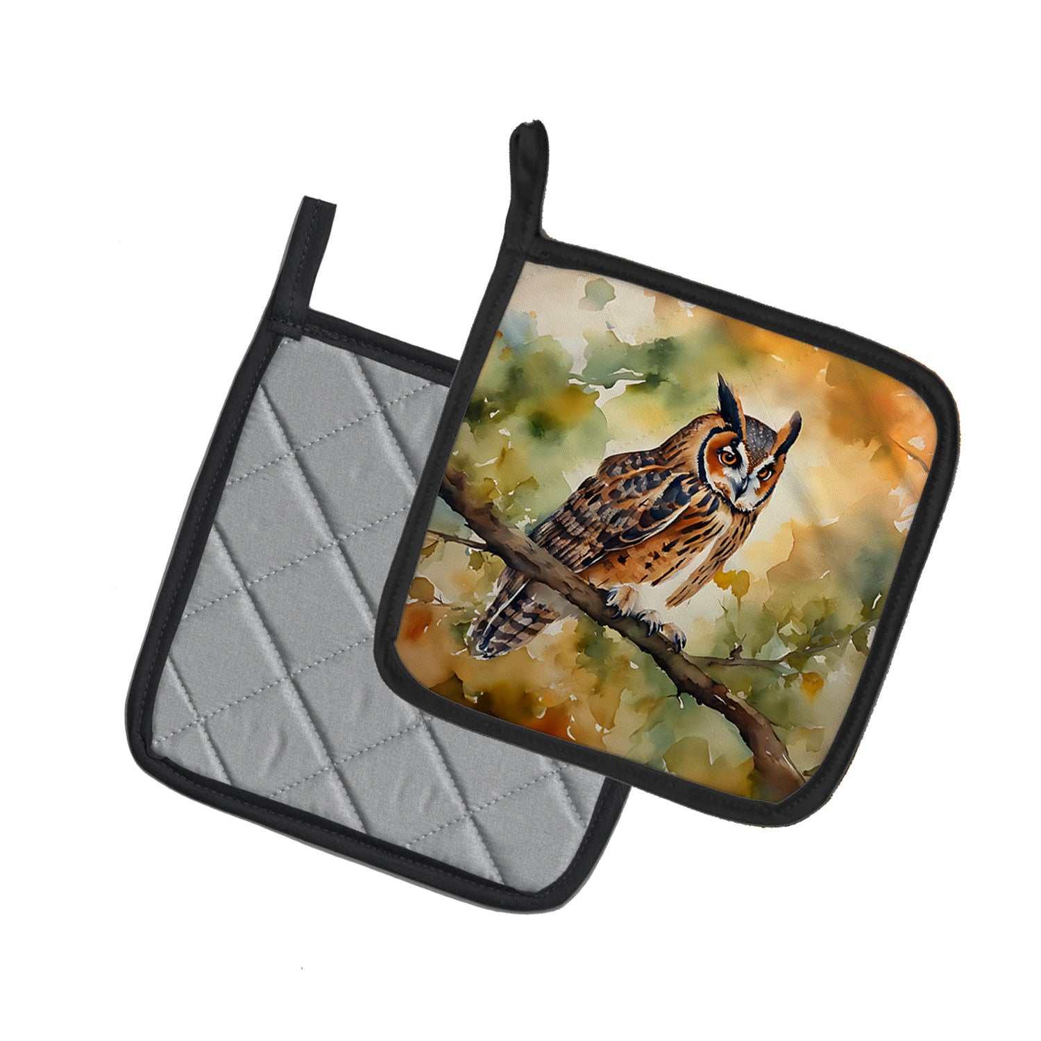 Pair of Pot Holders featuring breed specific Long-Eared Owl artwork. A Pair of Pot Holders to match your kitchen decor. Made in the USA these are thick and functional. Full color artwork decorates the front polyester fabric of the hot pad and accented by a black trim. Use these at as a trivet for your Thanksgiving or Christmas tablescape. Filled with insulated fabric and quilted for durability. These colorful pot holders will make a great gift for your favorite home cook or executive chef. Each pot holder measures approximately 7 1/2 inches by 7 1/2 inches. A hanging tab is included.
