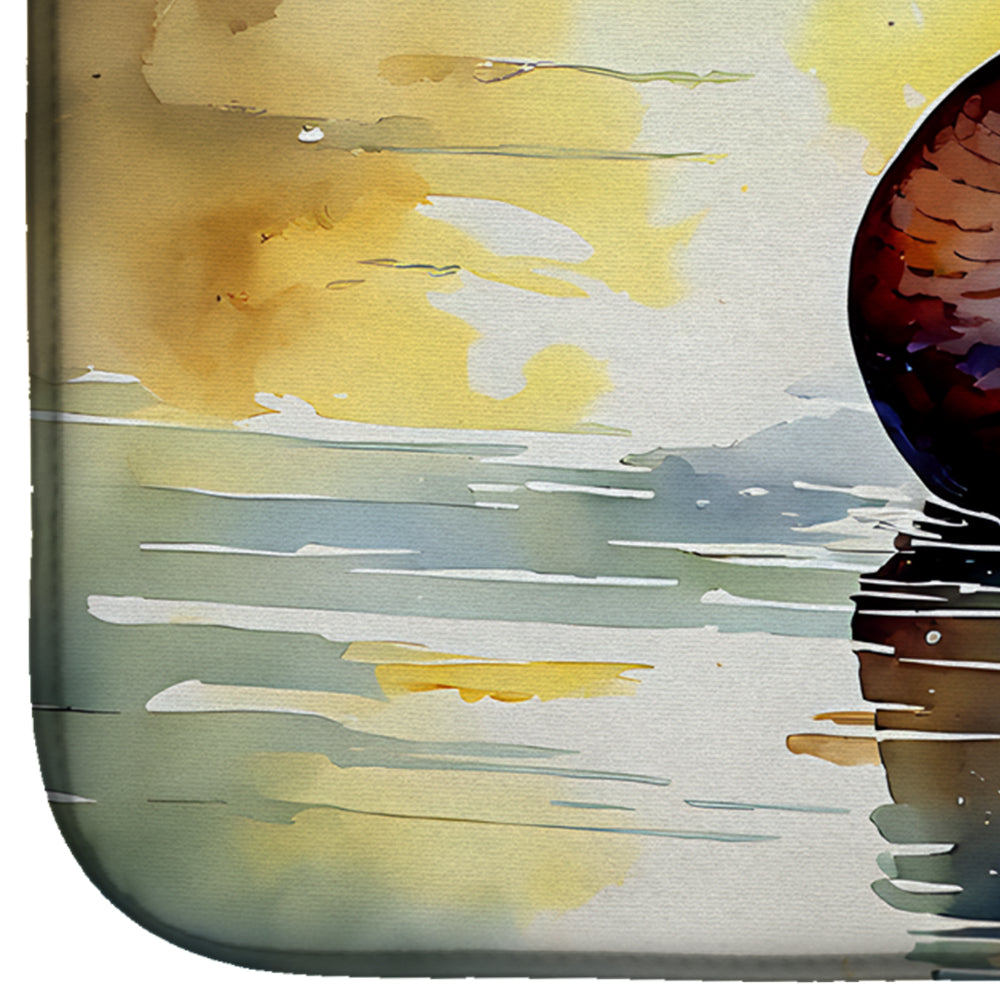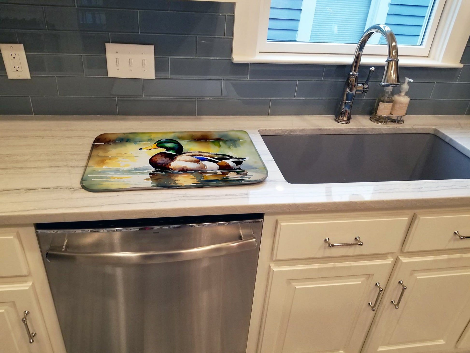 Dish Drying Mat featuring breed specific Mallard artwork. Say goodbye to messy countertops and soggy dish towels with our innovative dish drying mat. Our high-quality dish drying pad is designed to keep your countertops dry while offering a stylish and efficient solution. Whether you're air drying dishes, glasses, stemware, silverware, pots, pans, bottles, or even fruits and vegetables, our dish mat is the perfect choice. The 14 inches x 22 inches size fits most counters and dish drying racks, and the non-slip design ensures stability. Made with water-absorbent polyester and a polyurethane foam insert, our dish drying mat is not only functional but also durable. It's machine washable and printed in the USA for long-lasting use. The beautiful artwork adds flair to your kitchen decor, making it a perfect housewarming gift or present for any occasion. Upgrade your kitchen experience with our absorbent and versatile dish drying mat.