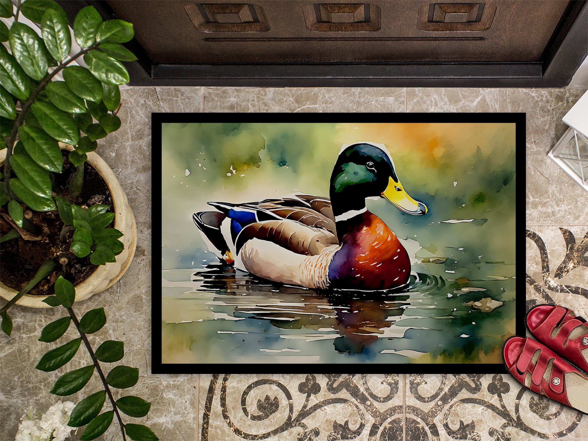Doormat featuring breed specific Mallard artwork. Welcome your guests in style with our Artwork Door Mat, designed to withstand almost any weather condition. This mat, measuring approximately 24 by 36 inches, is held together by durable black binding tape. Its top layer, composed of polyester felt, is dyed with the eye-catching image you see on the mat. A few layers below provide the mat with stability, while its rubber bottom is stamped to help prevent slipping and ensures safety. Our mat works wonderfully as both an indoor or outdoor door mat. For cleaning, simply hose it off with water or use a power washer - no need for any cleaner that produces suds. Avoid scrubbing with a brush, instead, opt for the vacuum on floor setting. Designed manufactured and printed in the USA, this mat is a perfect addition to your porch, outdoor kitchen, entryway, or any indoor space. Its unique design makes it a charming decorative rug that greets your guests and adds a stylish touch to your home decor.