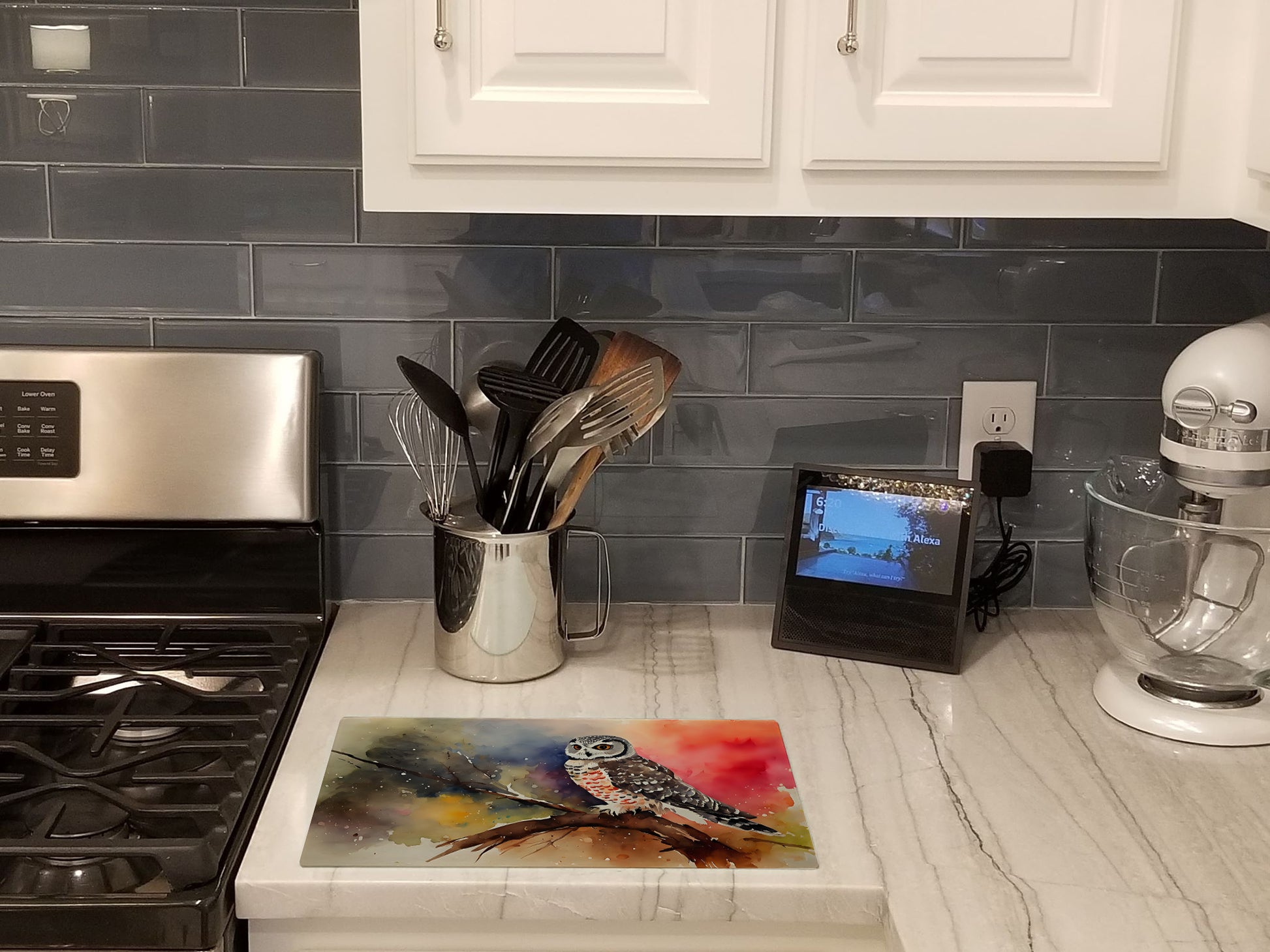 Glass Cutting Board featuring breed specific Northern Hawk Owl artwork. Introduce your kitchen to the vibrant, large Decorative Glass Cutting Board from Caroline's Treasures. Crafted from resilient tempered glass, this board is not only a utilitarian necessity but also a colorful art piece. With its generous dimensions of 15 inches in height and 12 inches in length, it offers ample space for all your cutting needs. Every piece showcases captivating artwork from distinguished artists, bringing an aesthetic edge to your kitchen. Beyond its attractive design, this cutting board ensures your countertop stays pristine and unscathed, owing to its heat-resistant properties. Engineered with user convenience in mind, it features non-skid feet for stability, and rounded corners for additional safety. Its robust construction renders it virtually unbreakable, guaranteeing longevity. The board comes with protective feet bumpers, maintaining its position during use. This product is recommended to be hand washed only. Proudly printed and assembled in the United States, this cutting board exemplifies superior craftsmanship. With Caroline's Treasures' Decorative Glass Cutting Board, you're investing in a blend of functionality and artistic flair.
