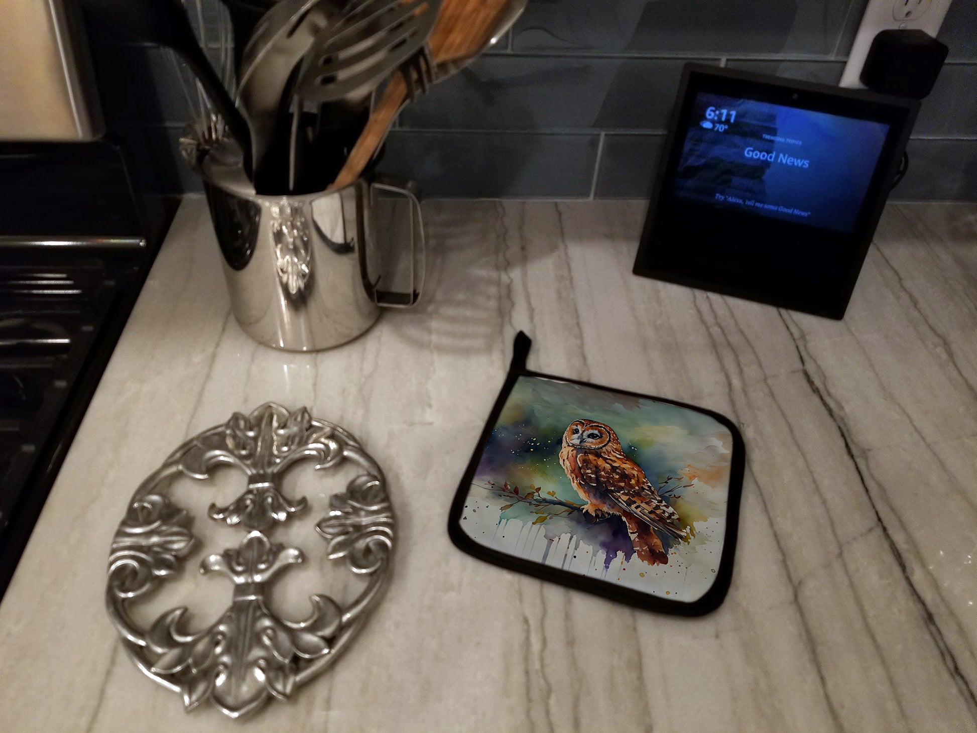 Pair of Pot Holders featuring breed specific Tawny Owl artwork. A Pair of Pot Holders to match your kitchen decor. Made in the USA these are thick and functional. Full color artwork decorates the front polyester fabric of the hot pad and accented by a black trim. Use these at as a trivet for your Thanksgiving or Christmas tablescape. Filled with insulated fabric and quilted for durability. These colorful pot holders will make a great gift for your favorite home cook or executive chef. Each pot holder measures approximately 7 1/2 inches by 7 1/2 inches. A hanging tab is included.
