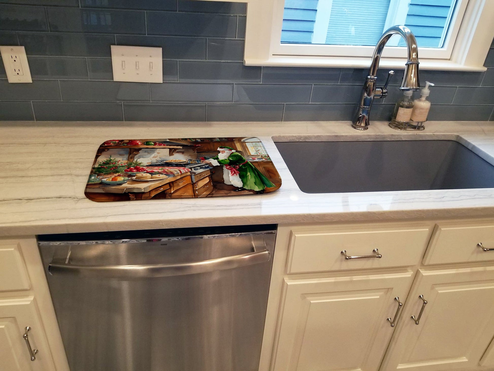 Dish Drying Mat featuring breed specific Santa Claus Father Christmas artwork. Celebrate Christmas with this Christmas Dish Drying Mat. Say goodbye to messy countertops and soggy dish towels with our innovative dish drying mat. Our high-quality dish drying pad is designed to keep your countertops dry while offering a stylish and efficient solution. Whether you're air drying dishes, glasses, stemware, silverware, pots, pans, bottles, or even fruits and vegetables, our dish mat is the perfect choice. The 14 inches x 22 inches size fits most counters and dish drying racks, and the non-slip design ensures stability. Made with water-absorbent polyester and a polyurethane foam insert, our dish drying mat is not only functional but also durable. It's machine washable and printed in the USA for long-lasting use. The beautiful artwork adds flair to your kitchen decor, making it a perfect housewarming gift or present for any occasion. Upgrade your kitchen experience with our absorbent and versatile dish drying mat.