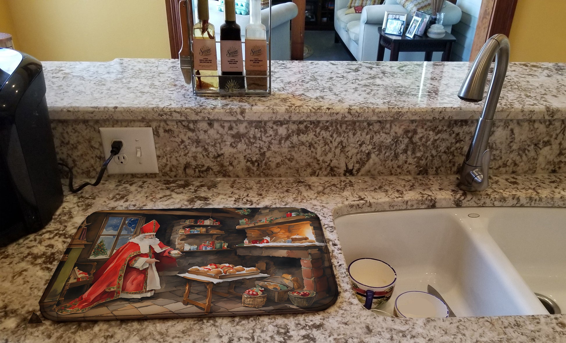 Dish Drying Mat featuring breed specific Santa Claus Sinterklaas artwork. Celebrate Christmas with this Christmas Dish Drying Mat. Say goodbye to messy countertops and soggy dish towels with our innovative dish drying mat. Our high-quality dish drying pad is designed to keep your countertops dry while offering a stylish and efficient solution. Whether you're air drying dishes, glasses, stemware, silverware, pots, pans, bottles, or even fruits and vegetables, our dish mat is the perfect choice. The 14 inches x 22 inches size fits most counters and dish drying racks, and the non-slip design ensures stability. Made with water-absorbent polyester and a polyurethane foam insert, our dish drying mat is not only functional but also durable. It's machine washable and printed in the USA for long-lasting use. The beautiful artwork adds flair to your kitchen decor, making it a perfect housewarming gift or present for any occasion. Upgrade your kitchen experience with our absorbent and versatile dish drying mat.