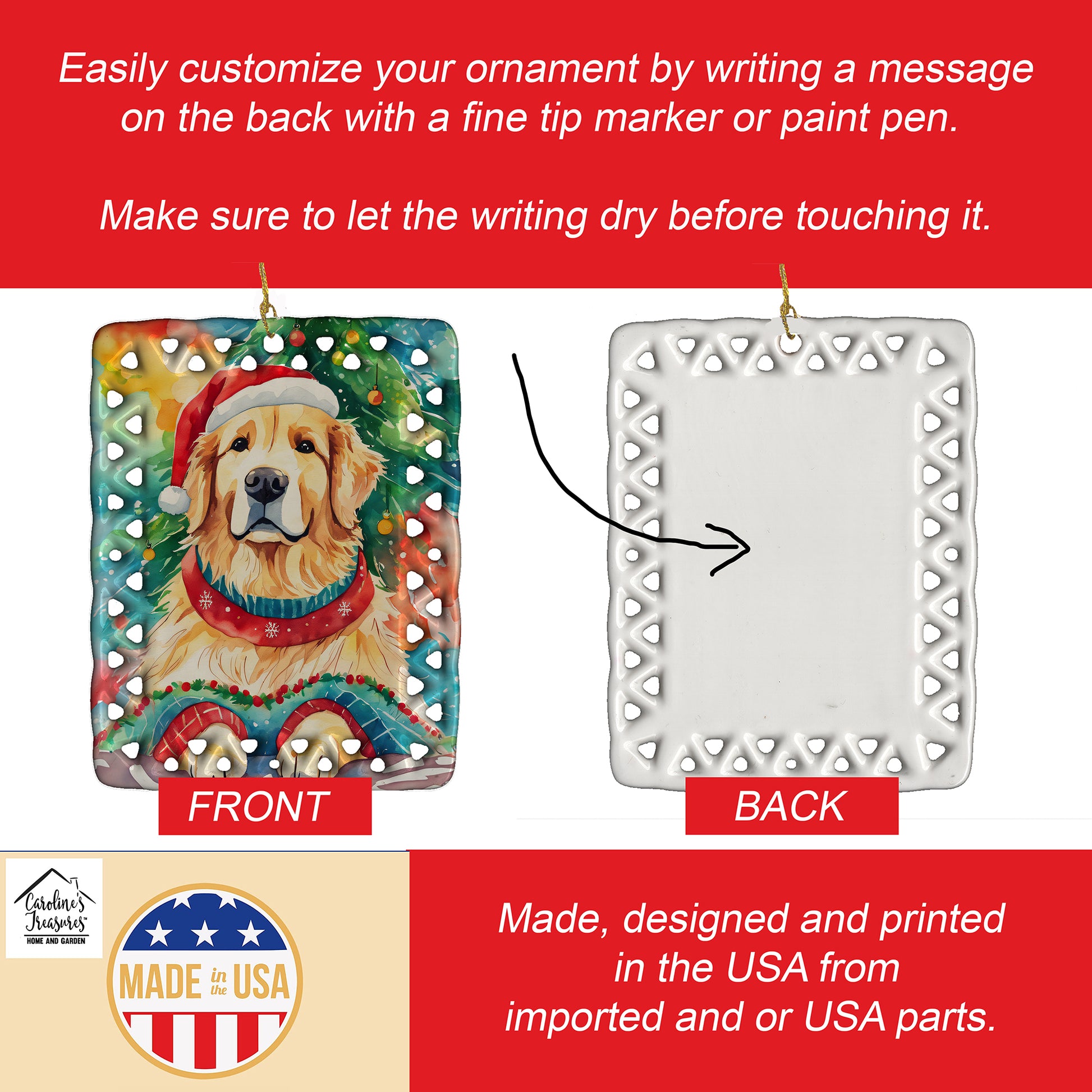 Porcelain Ornament featuring breed specific Golden Retriever artwork. Celebrate Christmas with this Christmas Ornament. Add a unique, personal touch to your holiday decor with our Rectangular Lattice Porcelain Ornament. Perfect for creating cherished memories, this high-quality ornament shines under festive lights, reflecting warmth and joy throughout your Christmas tree. Crafted with a glossy finish, it showcases vibrant, full-color artwork contributed by our talented artists, ensuring your tree is adorned with a burst of color and holiday spirit. What sets this Porcelain Ornament apart is its customizable white back. Use a paint pen or permanent marker to write a heartfelt message, commemorate a special year, or mark an unforgettable date, turning this ornament into a keepsake that will be treasured for years to come. For best results, allow any personalization to dry thoroughly before handling. Each ornament comes complete with a delicate gold cord, making it easy to hang and display. Proudly made in the USA, this ornament measures 3.375 x 2.625 inches and is a thoughtful gift for pet sitters, teachers, family members, or anyone who would appreciate a little extra holiday magic. Bring style, charm, and a touch of personal meaning to your Christmas tree with this beautifully designed ornament..