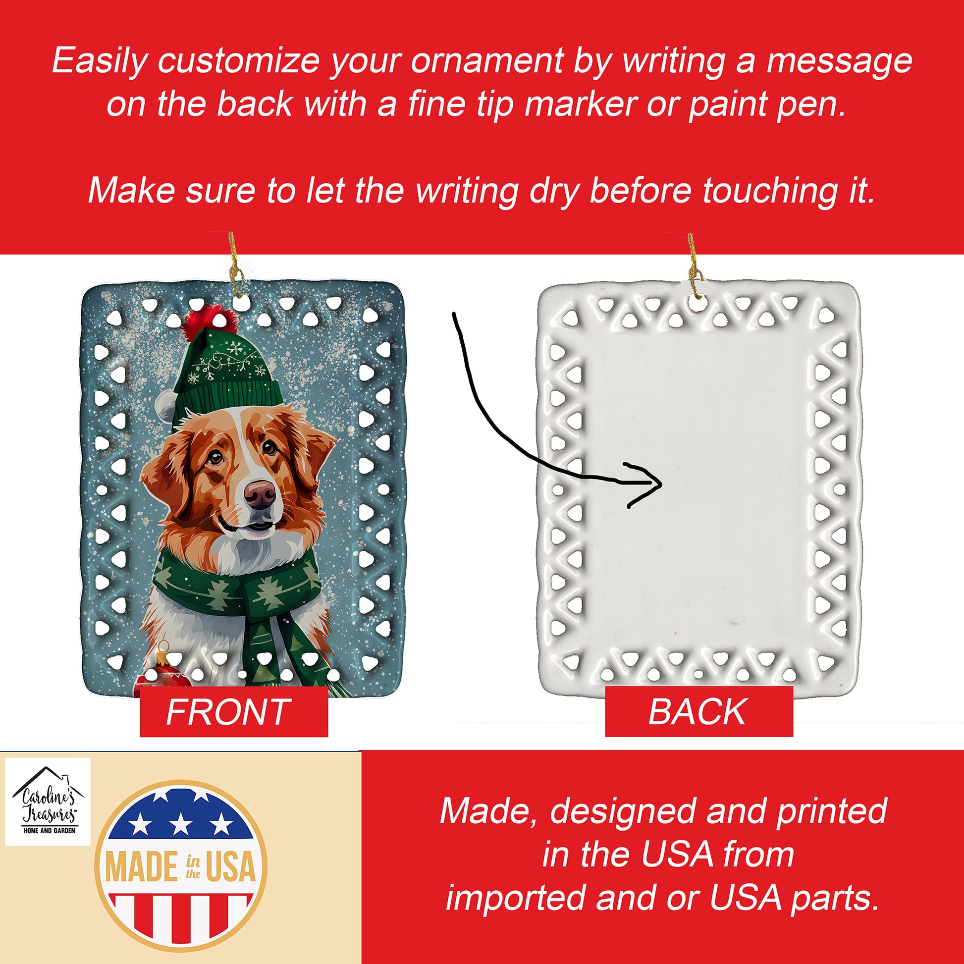 Porcelain Ornament featuring breed specific Nova Scotia Duck Tolling Retriever artwork. Celebrate Christmas with this Christmas Ornament. Add a unique, personal touch to your holiday decor with our Rectangular Lattice Porcelain Ornament. Perfect for creating cherished memories, this high-quality ornament shines under festive lights, reflecting warmth and joy throughout your Christmas tree. Crafted with a glossy finish, it showcases vibrant, full-color artwork contributed by our talented artists, ensuring your tree is adorned with a burst of color and holiday spirit. What sets this Porcelain Ornament apart is its customizable white back. Use a paint pen or permanent marker to write a heartfelt message, commemorate a special year, or mark an unforgettable date, turning this ornament into a keepsake that will be treasured for years to come. For best results, allow any personalization to dry thoroughly before handling. Each ornament comes complete with a delicate gold cord, making it easy to hang and display. Proudly made in the USA, this ornament measures 3.375 x 2.625 inches and is a thoughtful gift for pet sitters, teachers, family members, or anyone who would appreciate a little extra holiday magic. Bring style, charm, and a touch of personal meaning to your Christmas tree with this beautifully designed ornament..