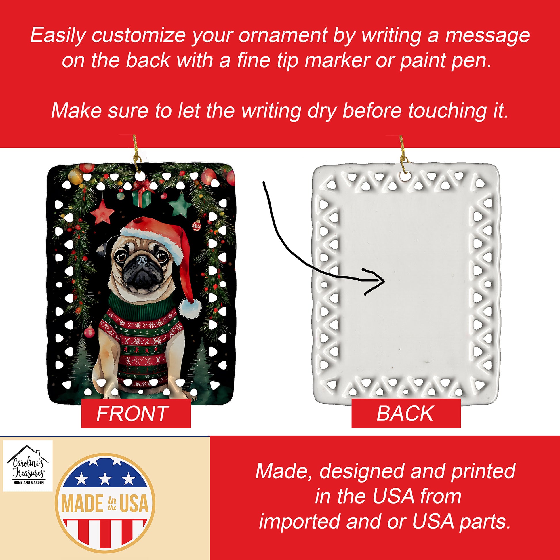 Porcelain Ornament featuring breed specific Pug artwork. Celebrate Christmas with this Christmas Ornament. Add a unique, personal touch to your holiday decor with our Rectangular Lattice Porcelain Ornament. Perfect for creating cherished memories, this high-quality ornament shines under festive lights, reflecting warmth and joy throughout your Christmas tree. Crafted with a glossy finish, it showcases vibrant, full-color artwork contributed by our talented artists, ensuring your tree is adorned with a burst of color and holiday spirit. What sets this Porcelain Ornament apart is its customizable white back. Use a paint pen or permanent marker to write a heartfelt message, commemorate a special year, or mark an unforgettable date, turning this ornament into a keepsake that will be treasured for years to come. For best results, allow any personalization to dry thoroughly before handling. Each ornament comes complete with a delicate gold cord, making it easy to hang and display. Proudly made in the USA, this ornament measures 3.375 x 2.625 inches and is a thoughtful gift for pet sitters, teachers, family members, or anyone who would appreciate a little extra holiday magic. Bring style, charm, and a touch of personal meaning to your Christmas tree with this beautifully designed ornament..