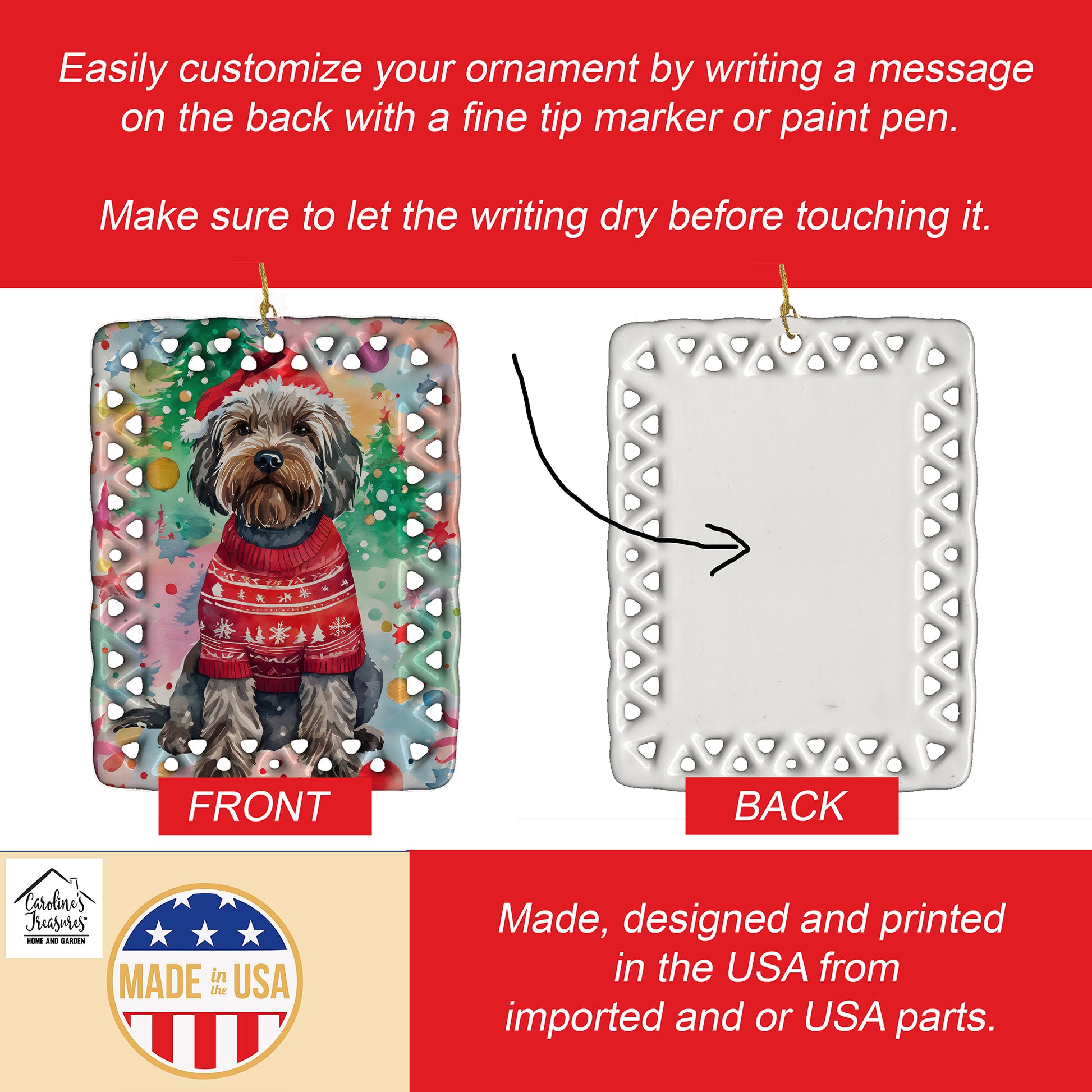 Porcelain Ornament featuring breed specific Wirehaired Pointing Griffon artwork. Celebrate Christmas with this Christmas Ornament. Add a unique, personal touch to your holiday decor with our Rectangular Lattice Porcelain Ornament. Perfect for creating cherished memories, this high-quality ornament shines under festive lights, reflecting warmth and joy throughout your Christmas tree. Crafted with a glossy finish, it showcases vibrant, full-color artwork contributed by our talented artists, ensuring your tree is adorned with a burst of color and holiday spirit. What sets this Porcelain Ornament apart is its customizable white back. Use a paint pen or permanent marker to write a heartfelt message, commemorate a special year, or mark an unforgettable date, turning this ornament into a keepsake that will be treasured for years to come. For best results, allow any personalization to dry thoroughly before handling. Each ornament comes complete with a delicate gold cord, making it easy to hang and display. Proudly made in the USA, this ornament measures 3.375 x 2.625 inches and is a thoughtful gift for pet sitters, teachers, family members, or anyone who would appreciate a little extra holiday magic. Bring style, charm, and a touch of personal meaning to your Christmas tree with this beautifully designed ornament..