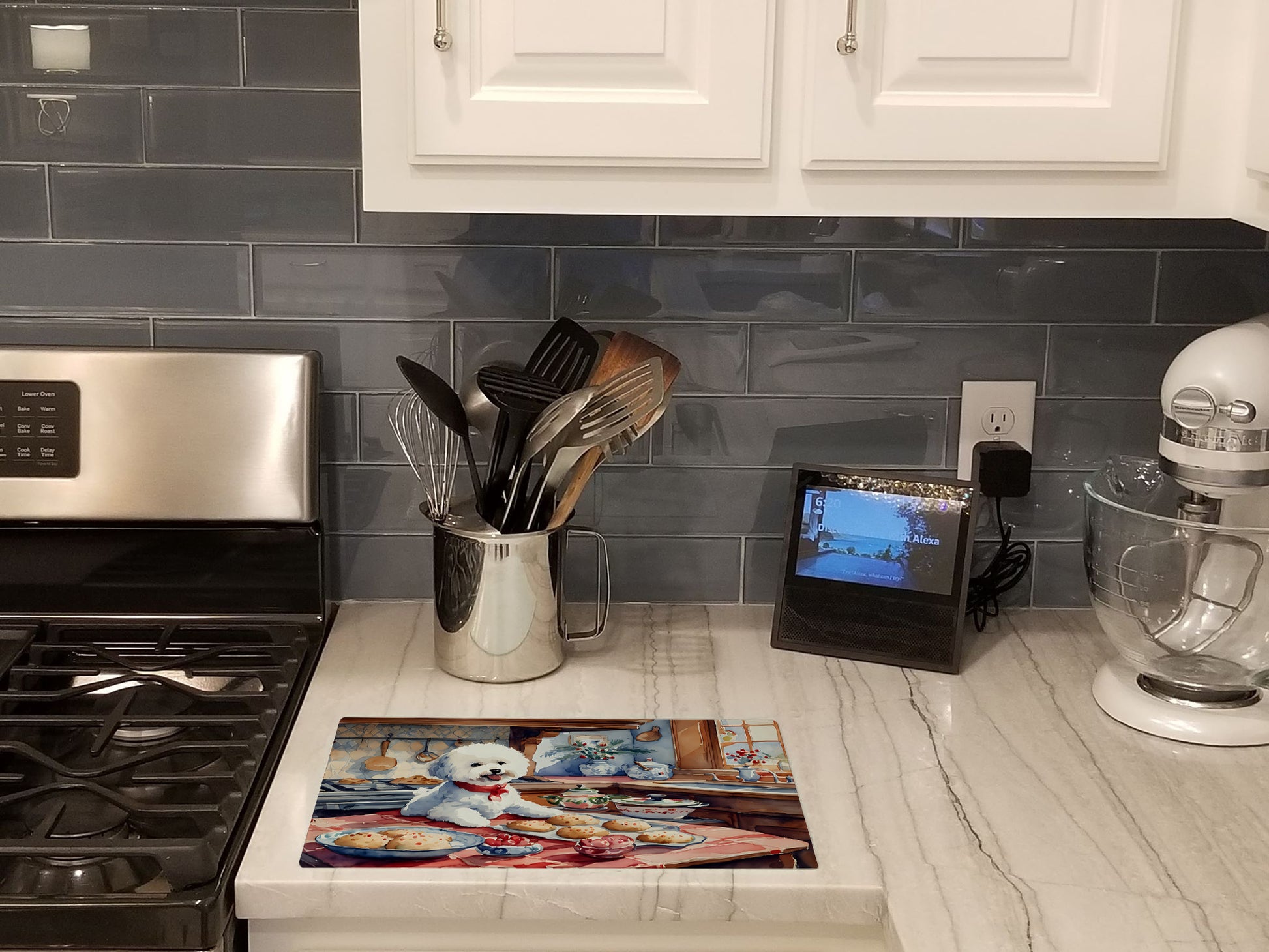 Glass Cutting Board featuring breed specific Bichon Frise artwork. Celebrate Christmas with this Christmas Cutting Board. Introduce your kitchen to the vibrant, large Decorative Glass Cutting Board from Caroline's Treasures. Crafted from resilient tempered glass, this board is not only a utilitarian necessity but also a colorful art piece. With its generous dimensions of 15 inches in height and 12 inches in length, it offers ample space for all your cutting needs. Every piece showcases captivating artwork from distinguished artists, bringing an aesthetic edge to your kitchen. Beyond its attractive design, this cutting board ensures your countertop stays pristine and unscathed, owing to its heat-resistant properties. Engineered with user convenience in mind, it features non-skid feet for stability, and rounded corners for additional safety. Its robust construction renders it virtually unbreakable, guaranteeing longevity. The board comes with protective feet bumpers, maintaining its position during use. This product is recommended to be hand washed only. Proudly printed and assembled in the United States, this cutting board exemplifies superior craftsmanship. With Caroline's Treasures' Decorative Glass Cutting Board, you're investing in a blend of functionality and artistic flair.