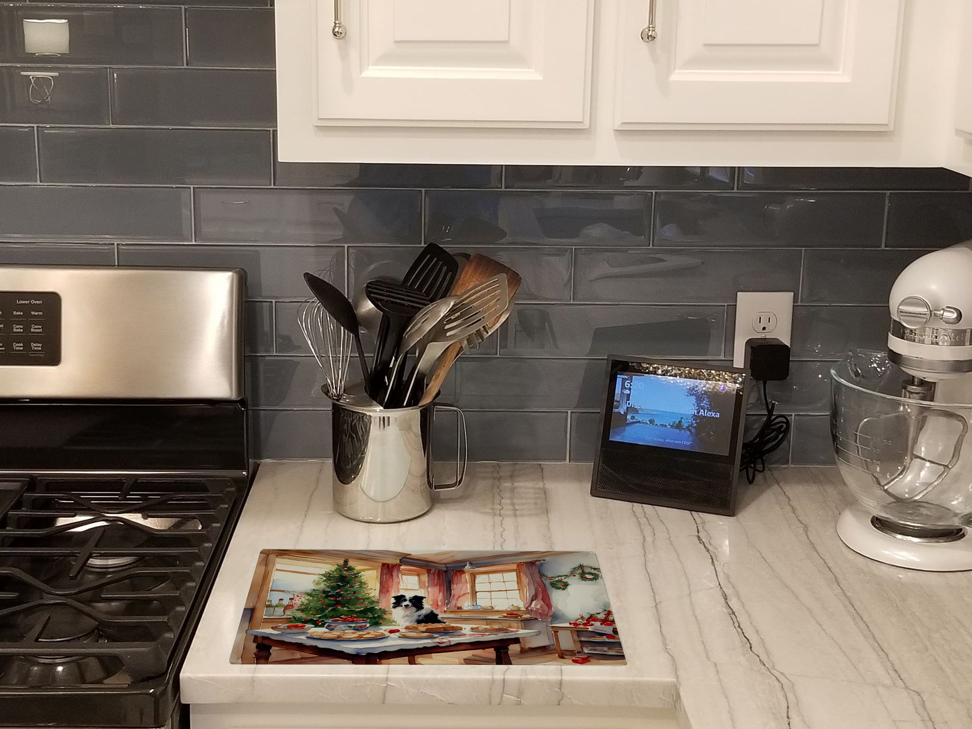 Glass Cutting Board featuring breed specific Border Collie artwork. Celebrate Christmas with this Christmas Cutting Board. Introduce your kitchen to the vibrant, large Decorative Glass Cutting Board from Caroline's Treasures. Crafted from resilient tempered glass, this board is not only a utilitarian necessity but also a colorful art piece. With its generous dimensions of 15 inches in height and 12 inches in length, it offers ample space for all your cutting needs. Every piece showcases captivating artwork from distinguished artists, bringing an aesthetic edge to your kitchen. Beyond its attractive design, this cutting board ensures your countertop stays pristine and unscathed, owing to its heat-resistant properties. Engineered with user convenience in mind, it features non-skid feet for stability, and rounded corners for additional safety. Its robust construction renders it virtually unbreakable, guaranteeing longevity. The board comes with protective feet bumpers, maintaining its position during use. This product is recommended to be hand washed only. Proudly printed and assembled in the United States, this cutting board exemplifies superior craftsmanship. With Caroline's Treasures' Decorative Glass Cutting Board, you're investing in a blend of functionality and artistic flair.
