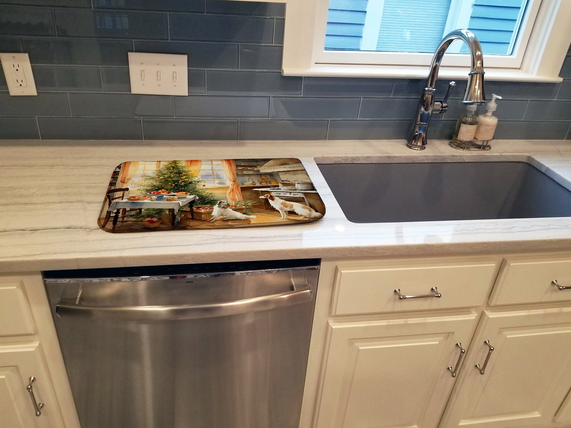 Dish Drying Mat featuring breed specific Borzoi Russian Wolfhound artwork. Celebrate Christmas with this Christmas Dish Drying Mat. Say goodbye to messy countertops and soggy dish towels with our innovative dish drying mat. Our high-quality dish drying pad is designed to keep your countertops dry while offering a stylish and efficient solution. Whether you're air drying dishes, glasses, stemware, silverware, pots, pans, bottles, or even fruits and vegetables, our dish mat is the perfect choice. The 14 inches x 22 inches size fits most counters and dish drying racks, and the non-slip design ensures stability. Made with water-absorbent polyester and a polyurethane foam insert, our dish drying mat is not only functional but also durable. It's machine washable and printed in the USA for long-lasting use. The beautiful artwork adds flair to your kitchen decor, making it a perfect housewarming gift or present for any occasion. Upgrade your kitchen experience with our absorbent and versatile dish drying mat.