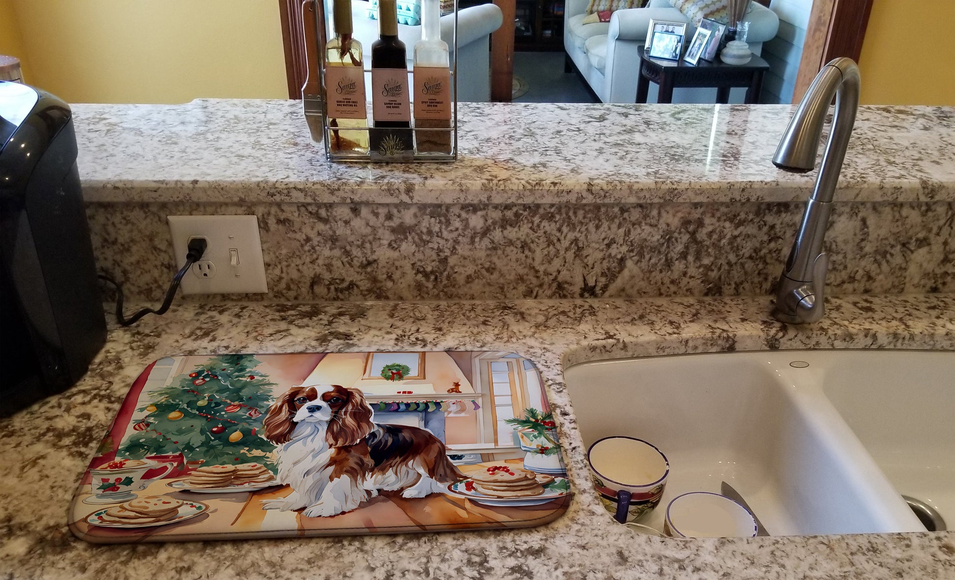Dish Drying Mat featuring breed specific Cavalier King Charles Spaniel artwork. Celebrate Christmas with this Christmas Dish Drying Mat. Say goodbye to messy countertops and soggy dish towels with our innovative dish drying mat. Our high-quality dish drying pad is designed to keep your countertops dry while offering a stylish and efficient solution. Whether you're air drying dishes, glasses, stemware, silverware, pots, pans, bottles, or even fruits and vegetables, our dish mat is the perfect choice. The 14 inches x 22 inches size fits most counters and dish drying racks, and the non-slip design ensures stability. Made with water-absorbent polyester and a polyurethane foam insert, our dish drying mat is not only functional but also durable. It's machine washable and printed in the USA for long-lasting use. The beautiful artwork adds flair to your kitchen decor, making it a perfect housewarming gift or present for any occasion. Upgrade your kitchen experience with our absorbent and versatile dish drying mat.