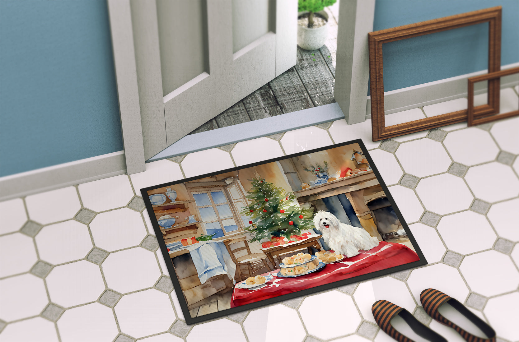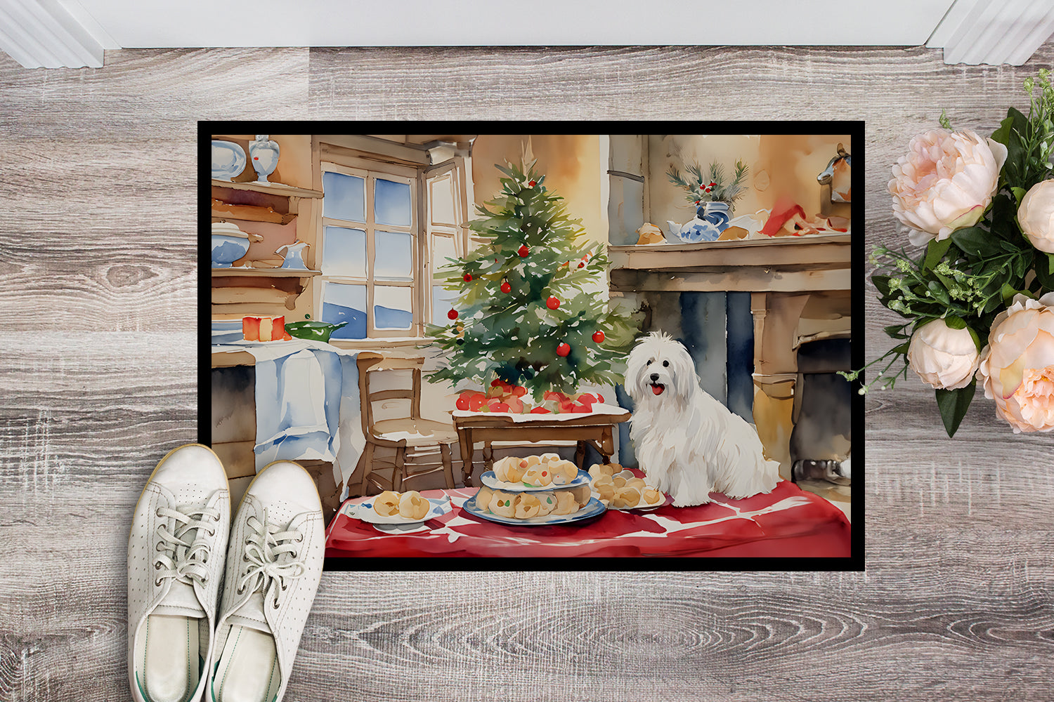 Doormat featuring breed specific Coton De Tulear artwork. Celebrate Christmas with this Christmas Doormat. Welcome your guests in style with our Artwork Door Mat, designed to withstand almost any weather condition. This mat, measuring approximately 24 by 36 inches, is held together by durable black binding tape. Its top layer, composed of polyester felt, is dyed with the eye-catching image you see on the mat. A few layers below provide the mat with stability, while its rubber bottom is stamped to help prevent slipping and ensures safety. Our mat works wonderfully as both an indoor or outdoor door mat. For cleaning, simply hose it off with water or use a power washer - no need for any cleaner that produces suds. Avoid scrubbing with a brush, instead, opt for the vacuum on floor setting. Designed manufactured and printed in the USA, this mat is a perfect addition to your porch, outdoor kitchen, entryway, or any indoor space. Its unique design makes it a charming decorative rug that greets your guests and adds a stylish touch to your home decor.