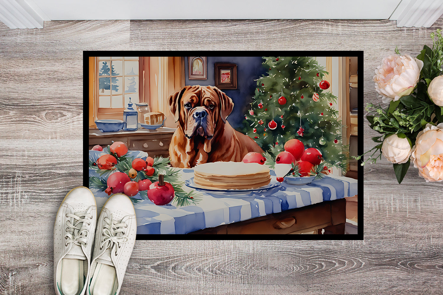 Doormat featuring breed specific Dogue de Bordeaux artwork. Celebrate Christmas with this Christmas Doormat. Welcome your guests in style with our Artwork Door Mat, designed to withstand almost any weather condition. This mat, measuring approximately 24 by 36 inches, is held together by durable black binding tape. Its top layer, composed of polyester felt, is dyed with the eye-catching image you see on the mat. A few layers below provide the mat with stability, while its rubber bottom is stamped to help prevent slipping and ensures safety. Our mat works wonderfully as both an indoor or outdoor door mat. For cleaning, simply hose it off with water or use a power washer - no need for any cleaner that produces suds. Avoid scrubbing with a brush, instead, opt for the vacuum on floor setting. Designed manufactured and printed in the USA, this mat is a perfect addition to your porch, outdoor kitchen, entryway, or any indoor space. Its unique design makes it a charming decorative rug that greets your guests and adds a stylish touch to your home decor.