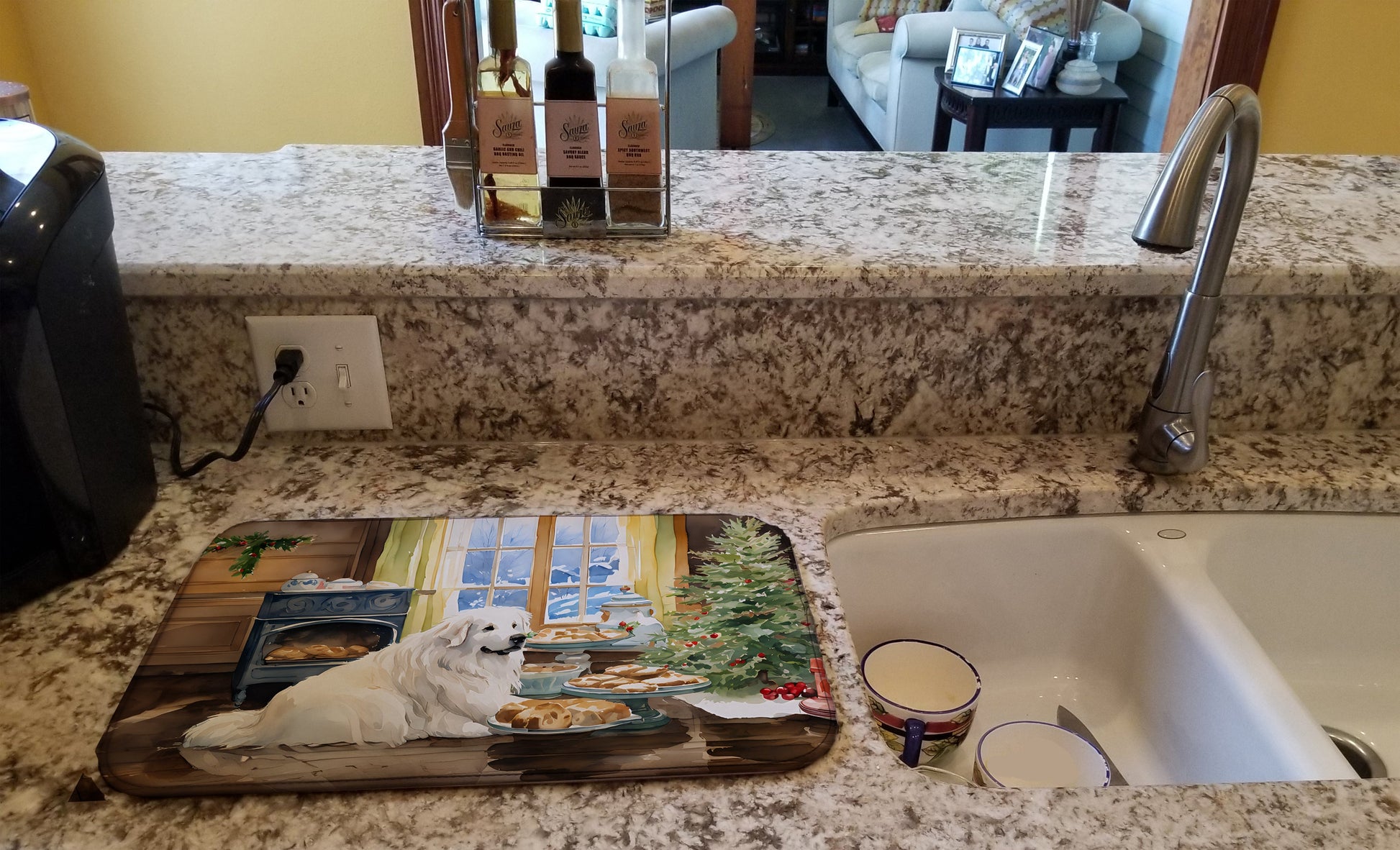 Dish Drying Mat featuring breed specific Great Pyrenees artwork. Celebrate Christmas with this Christmas Dish Drying Mat. Say goodbye to messy countertops and soggy dish towels with our innovative dish drying mat. Our high-quality dish drying pad is designed to keep your countertops dry while offering a stylish and efficient solution. Whether you're air drying dishes, glasses, stemware, silverware, pots, pans, bottles, or even fruits and vegetables, our dish mat is the perfect choice. The 14 inches x 22 inches size fits most counters and dish drying racks, and the non-slip design ensures stability. Made with water-absorbent polyester and a polyurethane foam insert, our dish drying mat is not only functional but also durable. It's machine washable and printed in the USA for long-lasting use. The beautiful artwork adds flair to your kitchen decor, making it a perfect housewarming gift or present for any occasion. Upgrade your kitchen experience with our absorbent and versatile dish drying mat.
