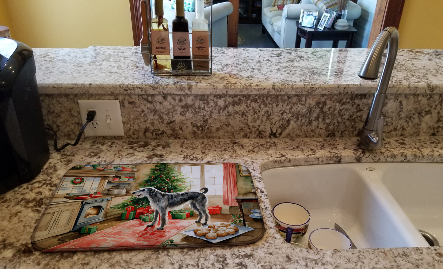 Dish Drying Mat featuring breed specific Irish Wolfhound artwork. Celebrate Christmas with this Christmas Dish Drying Mat. Say goodbye to messy countertops and soggy dish towels with our innovative dish drying mat. Our high-quality dish drying pad is designed to keep your countertops dry while offering a stylish and efficient solution. Whether you're air drying dishes, glasses, stemware, silverware, pots, pans, bottles, or even fruits and vegetables, our dish mat is the perfect choice. The 14 inches x 22 inches size fits most counters and dish drying racks, and the non-slip design ensures stability. Made with water-absorbent polyester and a polyurethane foam insert, our dish drying mat is not only functional but also durable. It's machine washable and printed in the USA for long-lasting use. The beautiful artwork adds flair to your kitchen decor, making it a perfect housewarming gift or present for any occasion. Upgrade your kitchen experience with our absorbent and versatile dish drying mat.