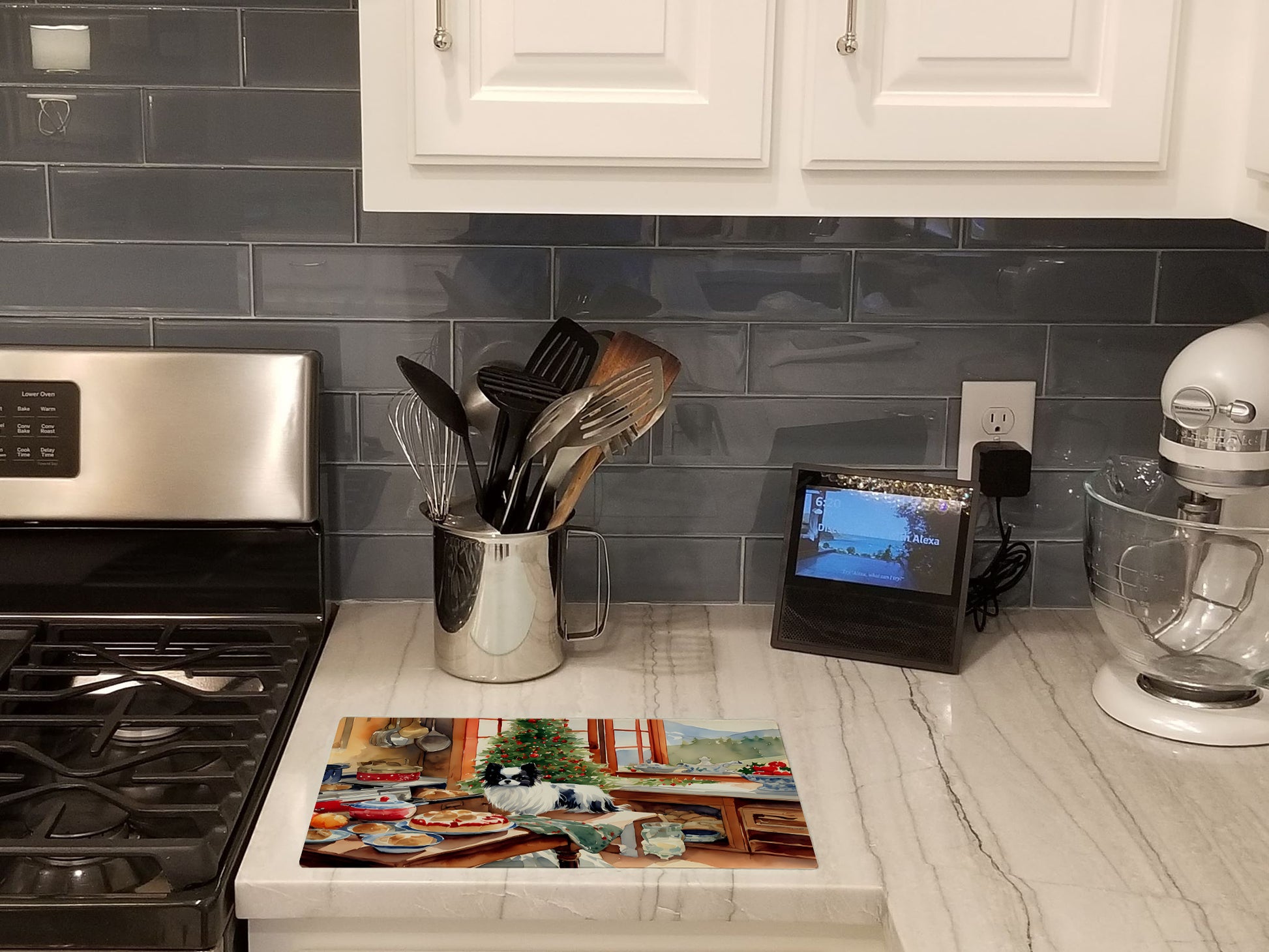 Glass Cutting Board featuring breed specific Japanese Chin artwork. Celebrate Christmas with this Christmas Cutting Board. Introduce your kitchen to the vibrant, large Decorative Glass Cutting Board from Caroline's Treasures. Crafted from resilient tempered glass, this board is not only a utilitarian necessity but also a colorful art piece. With its generous dimensions of 15 inches in height and 12 inches in length, it offers ample space for all your cutting needs. Every piece showcases captivating artwork from distinguished artists, bringing an aesthetic edge to your kitchen. Beyond its attractive design, this cutting board ensures your countertop stays pristine and unscathed, owing to its heat-resistant properties. Engineered with user convenience in mind, it features non-skid feet for stability, and rounded corners for additional safety. Its robust construction renders it virtually unbreakable, guaranteeing longevity. The board comes with protective feet bumpers, maintaining its position during use. This product is recommended to be hand washed only. Proudly printed and assembled in the United States, this cutting board exemplifies superior craftsmanship. With Caroline's Treasures' Decorative Glass Cutting Board, you're investing in a blend of functionality and artistic flair.