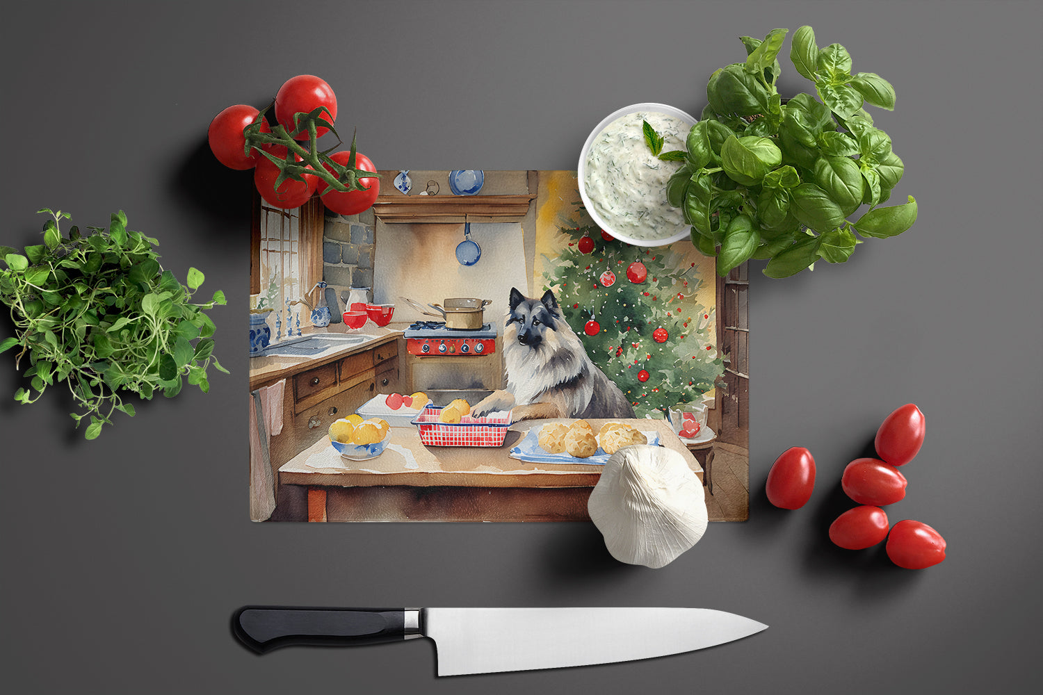 Glass Cutting Board featuring breed specific Keeshond artwork. Celebrate Christmas with this Christmas Cutting Board. Introduce your kitchen to the vibrant, large Decorative Glass Cutting Board from Caroline's Treasures. Crafted from resilient tempered glass, this board is not only a utilitarian necessity but also a colorful art piece. With its generous dimensions of 15 inches in height and 12 inches in length, it offers ample space for all your cutting needs. Every piece showcases captivating artwork from distinguished artists, bringing an aesthetic edge to your kitchen. Beyond its attractive design, this cutting board ensures your countertop stays pristine and unscathed, owing to its heat-resistant properties. Engineered with user convenience in mind, it features non-skid feet for stability, and rounded corners for additional safety. Its robust construction renders it virtually unbreakable, guaranteeing longevity. The board comes with protective feet bumpers, maintaining its position during use. This product is recommended to be hand washed only. Proudly printed and assembled in the United States, this cutting board exemplifies superior craftsmanship. With Caroline's Treasures' Decorative Glass Cutting Board, you're investing in a blend of functionality and artistic flair.