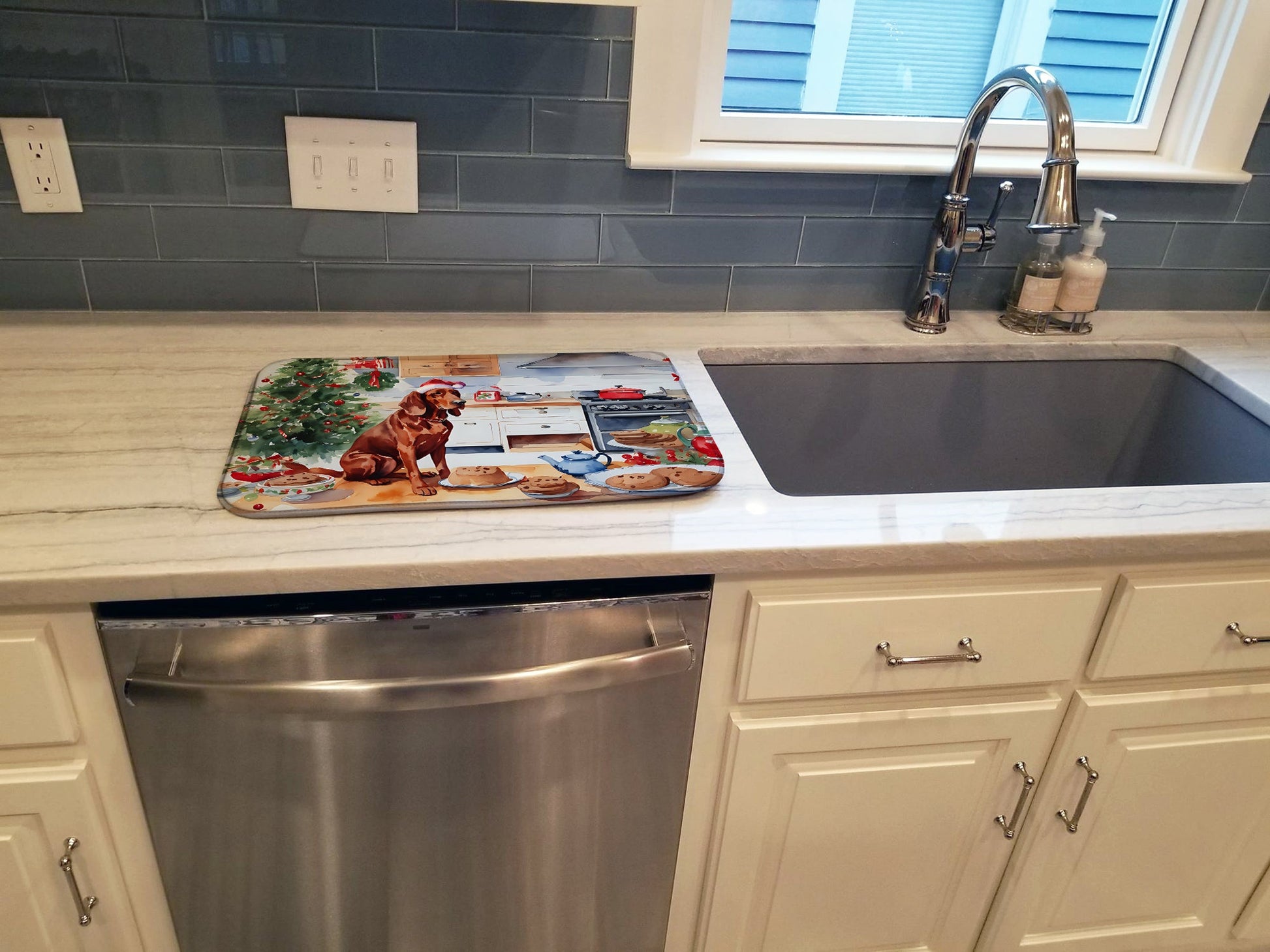 Dish Drying Mat featuring breed specific Redbone Coonhound artwork. Celebrate Christmas with this Christmas Dish Drying Mat. Say goodbye to messy countertops and soggy dish towels with our innovative dish drying mat. Our high-quality dish drying pad is designed to keep your countertops dry while offering a stylish and efficient solution. Whether you're air drying dishes, glasses, stemware, silverware, pots, pans, bottles, or even fruits and vegetables, our dish mat is the perfect choice. The 14 inches x 22 inches size fits most counters and dish drying racks, and the non-slip design ensures stability. Made with water-absorbent polyester and a polyurethane foam insert, our dish drying mat is not only functional but also durable. It's machine washable and printed in the USA for long-lasting use. The beautiful artwork adds flair to your kitchen decor, making it a perfect housewarming gift or present for any occasion. Upgrade your kitchen experience with our absorbent and versatile dish drying mat.