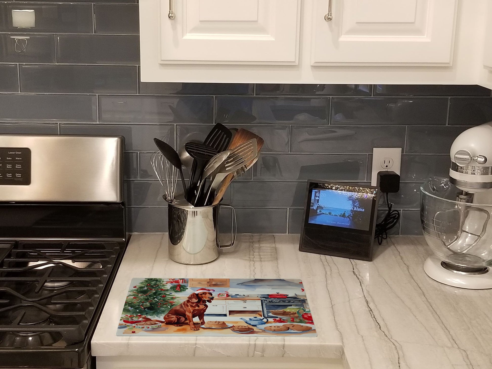 Glass Cutting Board featuring breed specific Redbone Coonhound artwork. Celebrate Christmas with this Christmas Cutting Board. Introduce your kitchen to the vibrant, large Decorative Glass Cutting Board from Caroline's Treasures. Crafted from resilient tempered glass, this board is not only a utilitarian necessity but also a colorful art piece. With its generous dimensions of 15 inches in height and 12 inches in length, it offers ample space for all your cutting needs. Every piece showcases captivating artwork from distinguished artists, bringing an aesthetic edge to your kitchen. Beyond its attractive design, this cutting board ensures your countertop stays pristine and unscathed, owing to its heat-resistant properties. Engineered with user convenience in mind, it features non-skid feet for stability, and rounded corners for additional safety. Its robust construction renders it virtually unbreakable, guaranteeing longevity. The board comes with protective feet bumpers, maintaining its position during use. This product is recommended to be hand washed only. Proudly printed and assembled in the United States, this cutting board exemplifies superior craftsmanship. With Caroline's Treasures' Decorative Glass Cutting Board, you're investing in a blend of functionality and artistic flair.