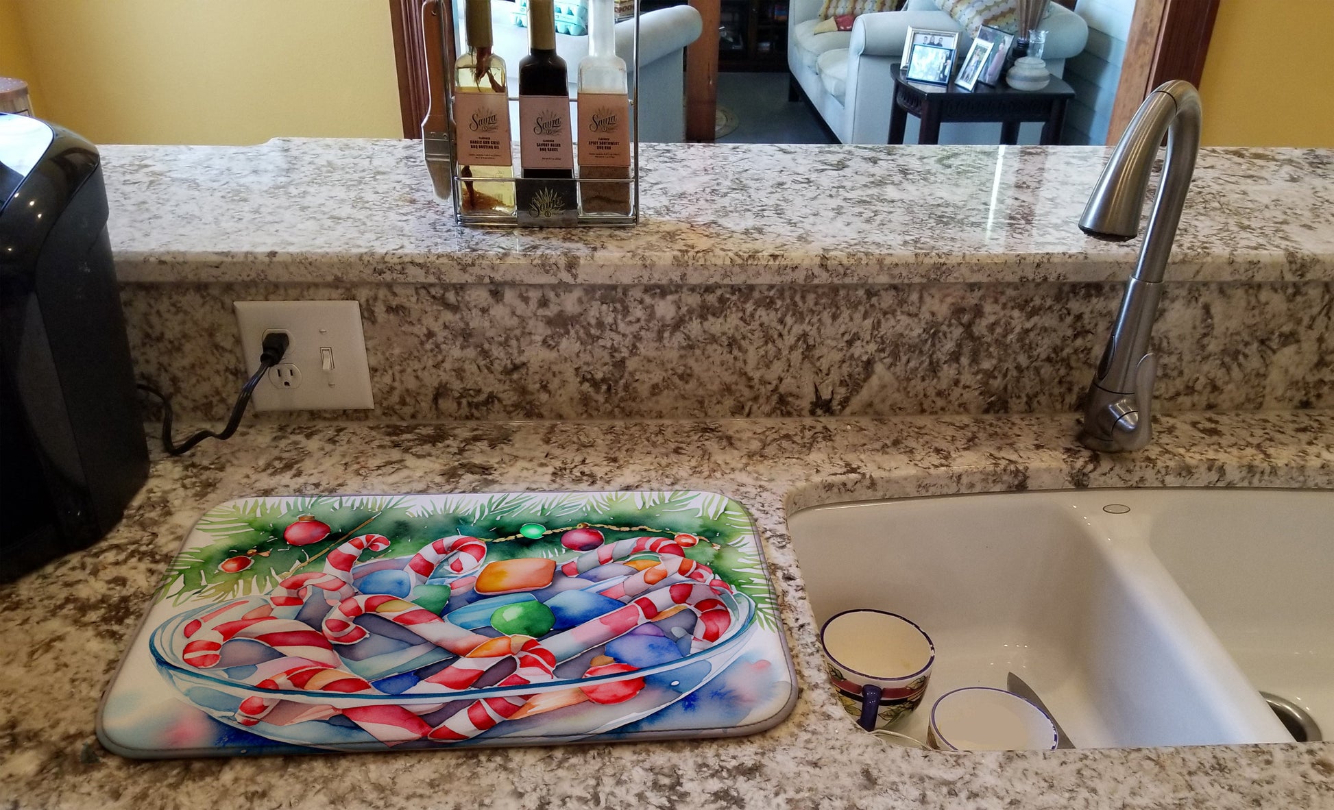 Celebrate Christmas with this Christmas Dish Drying Mat. Say goodbye to messy countertops and soggy dish towels with our innovative dish drying mat. Our high-quality dish drying pad is designed to keep your countertops dry while offering a stylish and efficient solution. Whether you're air drying dishes, glasses, stemware, silverware, pots, pans, bottles, or even fruits and vegetables, our dish mat is the perfect choice. The 14 inches x 22 inches size fits most counters and dish drying racks, and the non-slip design ensures stability. Made with water-absorbent polyester and a polyurethane foam insert, our dish drying mat is not only functional but also durable. It's machine washable and printed in the USA for long-lasting use. The beautiful artwork adds flair to your kitchen decor, making it a perfect housewarming gift or present for any occasion. Upgrade your kitchen experience with our absorbent and versatile dish drying mat.