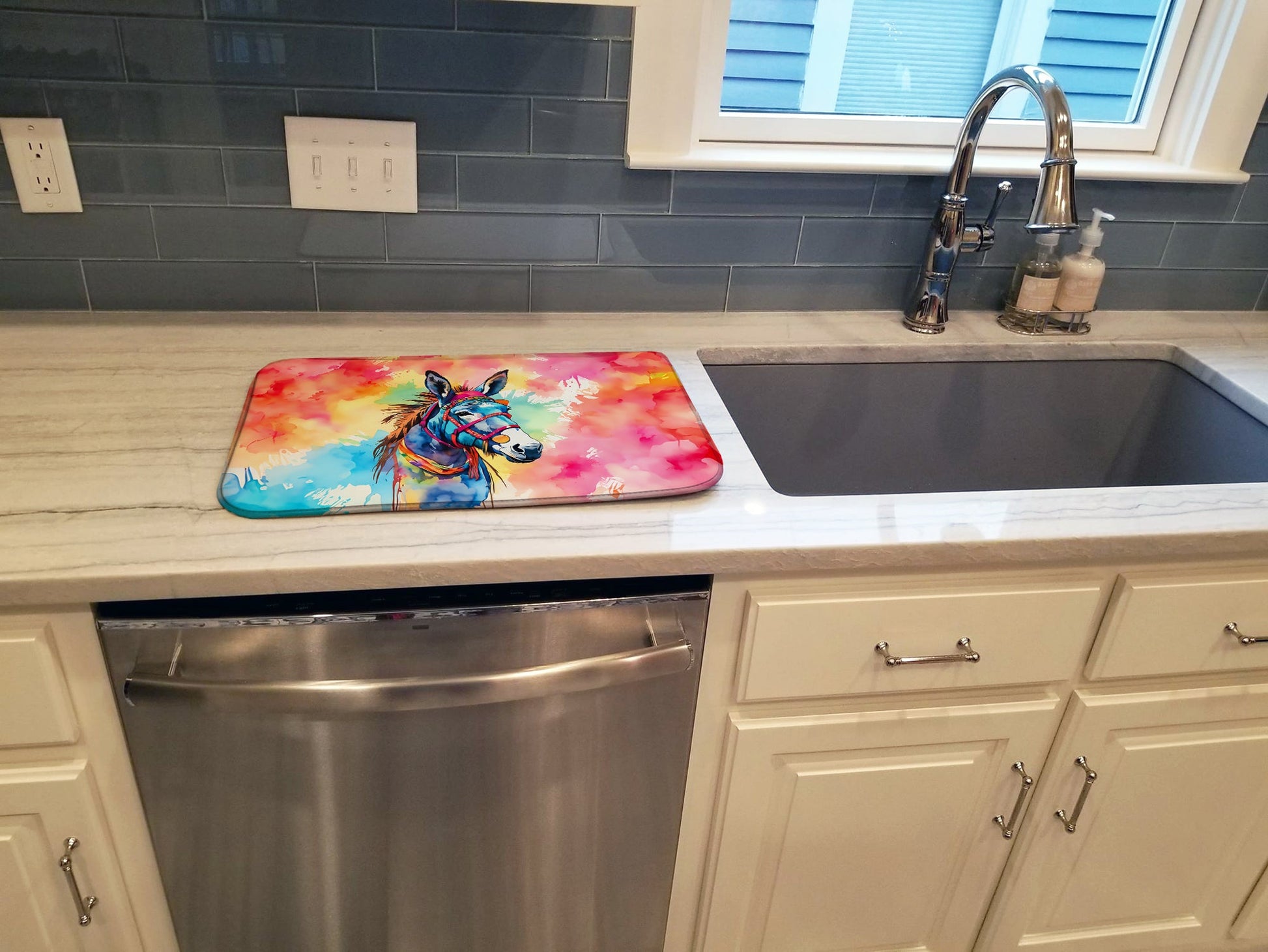 Dish Drying Mat featuring breed specific Donkey artwork. Say goodbye to messy countertops and soggy dish towels with our innovative dish drying mat. Our high-quality dish drying pad is designed to keep your countertops dry while offering a stylish and efficient solution. Whether you're air drying dishes, glasses, stemware, silverware, pots, pans, bottles, or even fruits and vegetables, our dish mat is the perfect choice. The 14 inches x 22 inches size fits most counters and dish drying racks, and the non-slip design ensures stability. Made with water-absorbent polyester and a polyurethane foam insert, our dish drying mat is not only functional but also durable. It's machine washable and printed in the USA for long-lasting use. The beautiful artwork adds flair to your kitchen decor, making it a perfect housewarming gift or present for any occasion. Upgrade your kitchen experience with our absorbent and versatile dish drying mat.