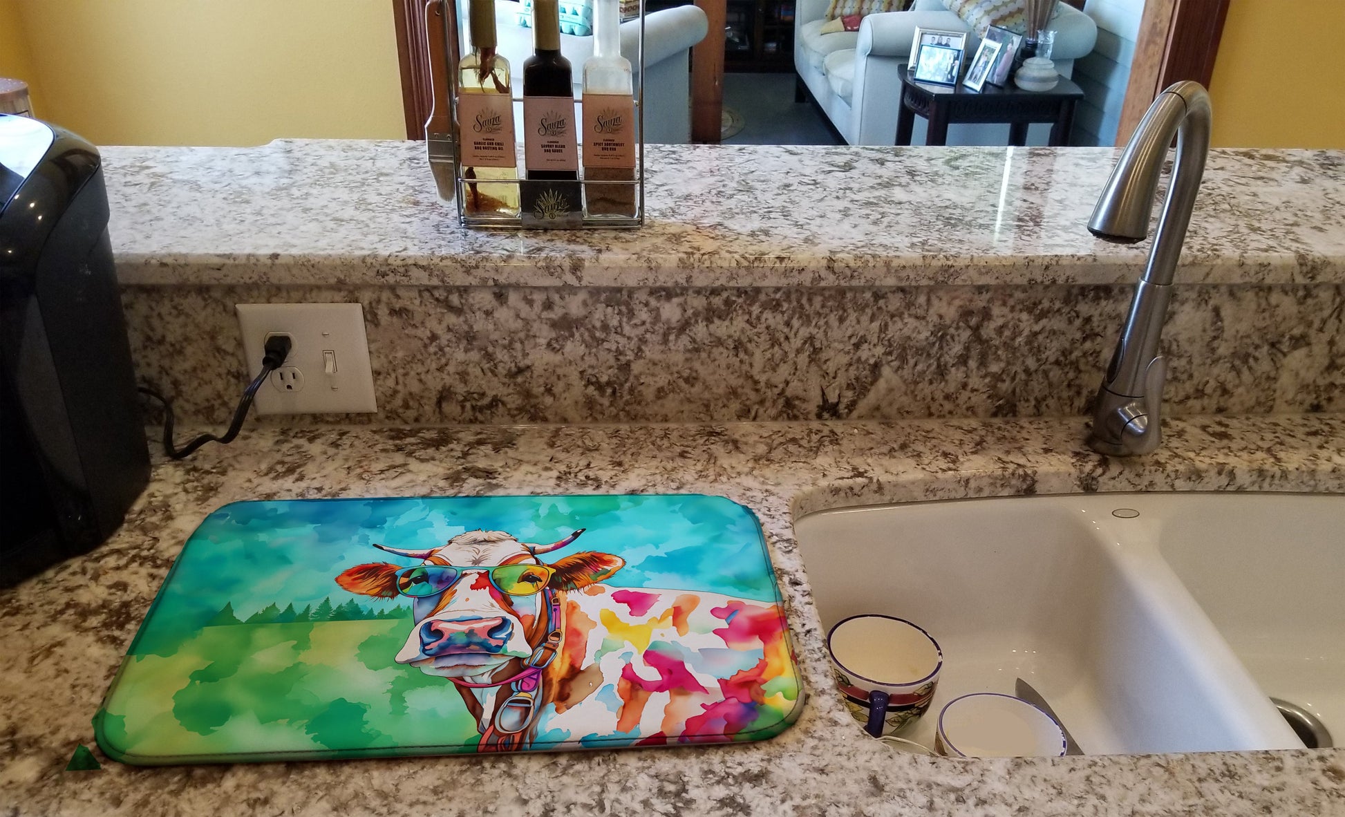 Dish Drying Mat featuring breed specific Cow artwork. Say goodbye to messy countertops and soggy dish towels with our innovative dish drying mat. Our high-quality dish drying pad is designed to keep your countertops dry while offering a stylish and efficient solution. Whether you're air drying dishes, glasses, stemware, silverware, pots, pans, bottles, or even fruits and vegetables, our dish mat is the perfect choice. The 14 inches x 22 inches size fits most counters and dish drying racks, and the non-slip design ensures stability. Made with water-absorbent polyester and a polyurethane foam insert, our dish drying mat is not only functional but also durable. It's machine washable and printed in the USA for long-lasting use. The beautiful artwork adds flair to your kitchen decor, making it a perfect housewarming gift or present for any occasion. Upgrade your kitchen experience with our absorbent and versatile dish drying mat.