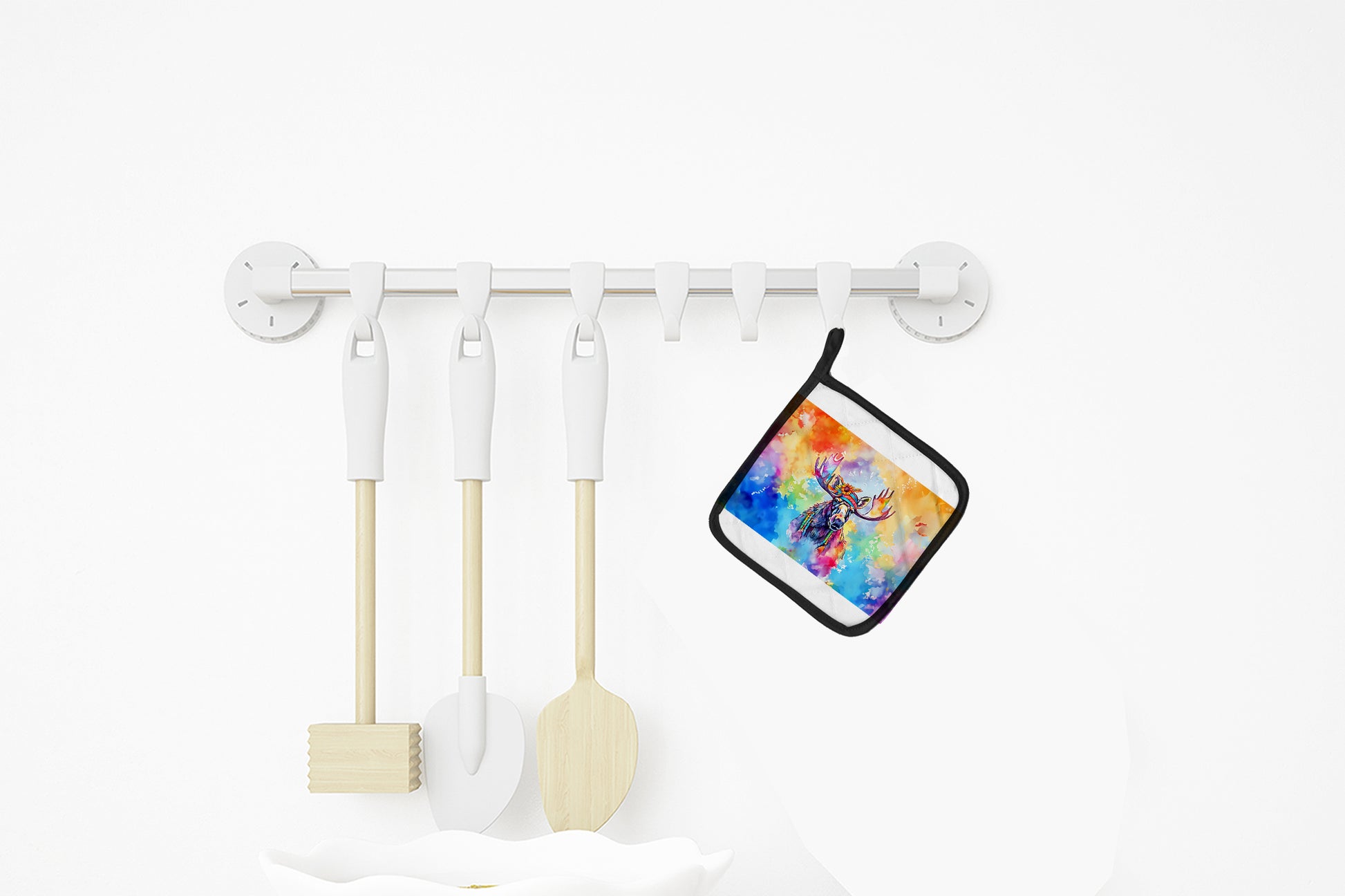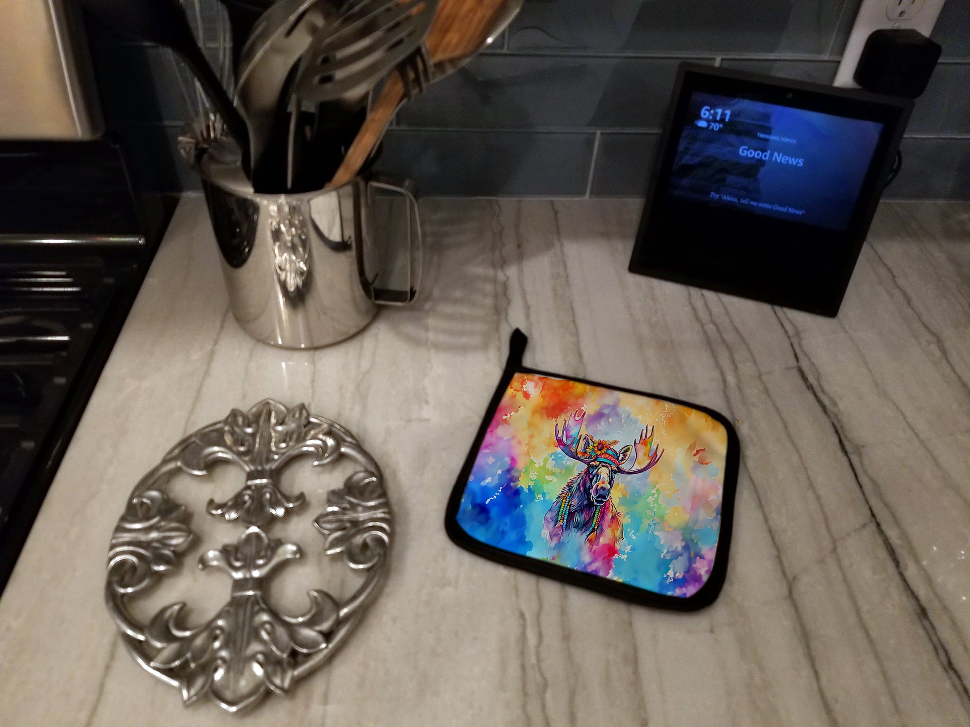 Pair of Pot Holders featuring breed specific Moose artwork. A Pair of Pot Holders to match your kitchen decor. Made in the USA these are thick and functional. Full color artwork decorates the front polyester fabric of the hot pad and accented by a black trim. Use these at as a trivet for your Thanksgiving or Christmas tablescape. Filled with insulated fabric and quilted for durability. These colorful pot holders will make a great gift for your favorite home cook or executive chef. Each pot holder measures approximately 7 1/2 inches by 7 1/2 inches. A hanging tab is included.