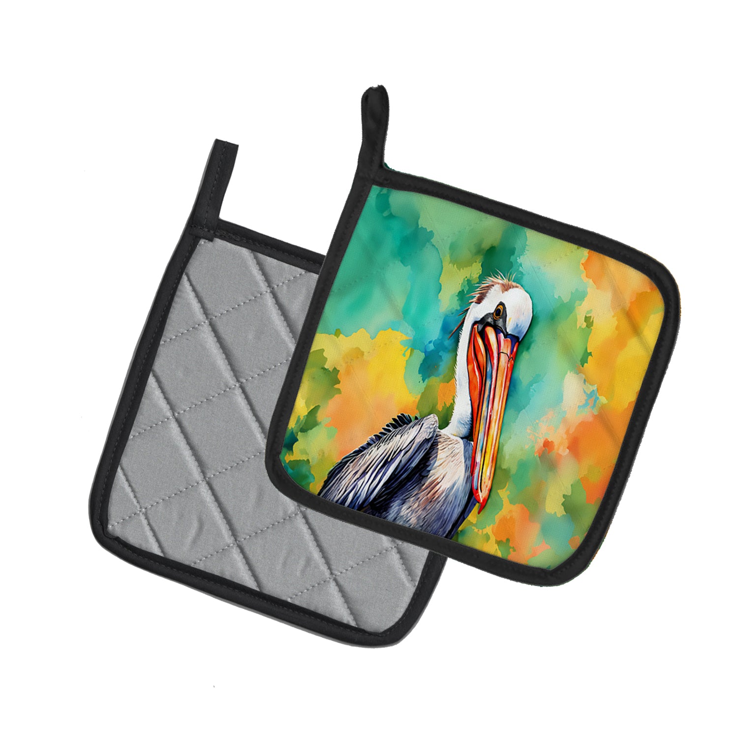 Pair of Pot Holders featuring breed specific Pelican artwork. A Pair of Pot Holders to match your kitchen decor. Made in the USA these are thick and functional. Full color artwork decorates the front polyester fabric of the hot pad and accented by a black trim. Use these at as a trivet for your Thanksgiving or Christmas tablescape. Filled with insulated fabric and quilted for durability. These colorful pot holders will make a great gift for your favorite home cook or executive chef. Each pot holder measures approximately 7 1/2 inches by 7 1/2 inches. A hanging tab is included.