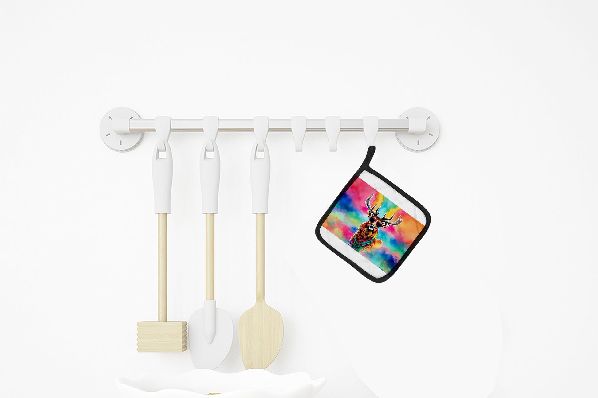 Pair of Pot Holders featuring breed specific Deer artwork. A Pair of Pot Holders to match your kitchen decor. Made in the USA these are thick and functional. Full color artwork decorates the front polyester fabric of the hot pad and accented by a black trim. Use these at as a trivet for your Thanksgiving or Christmas tablescape. Filled with insulated fabric and quilted for durability. These colorful pot holders will make a great gift for your favorite home cook or executive chef. Each pot holder measures approximately 7 1/2 inches by 7 1/2 inches. A hanging tab is included.