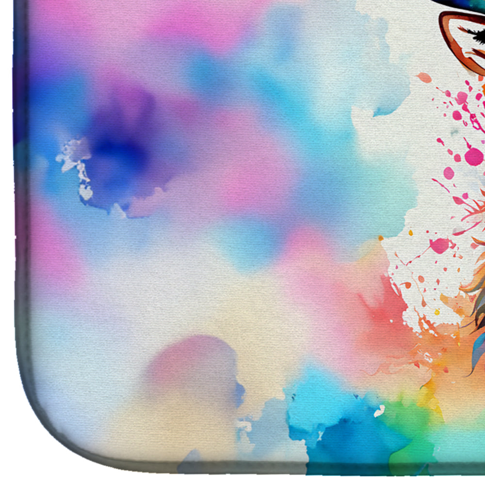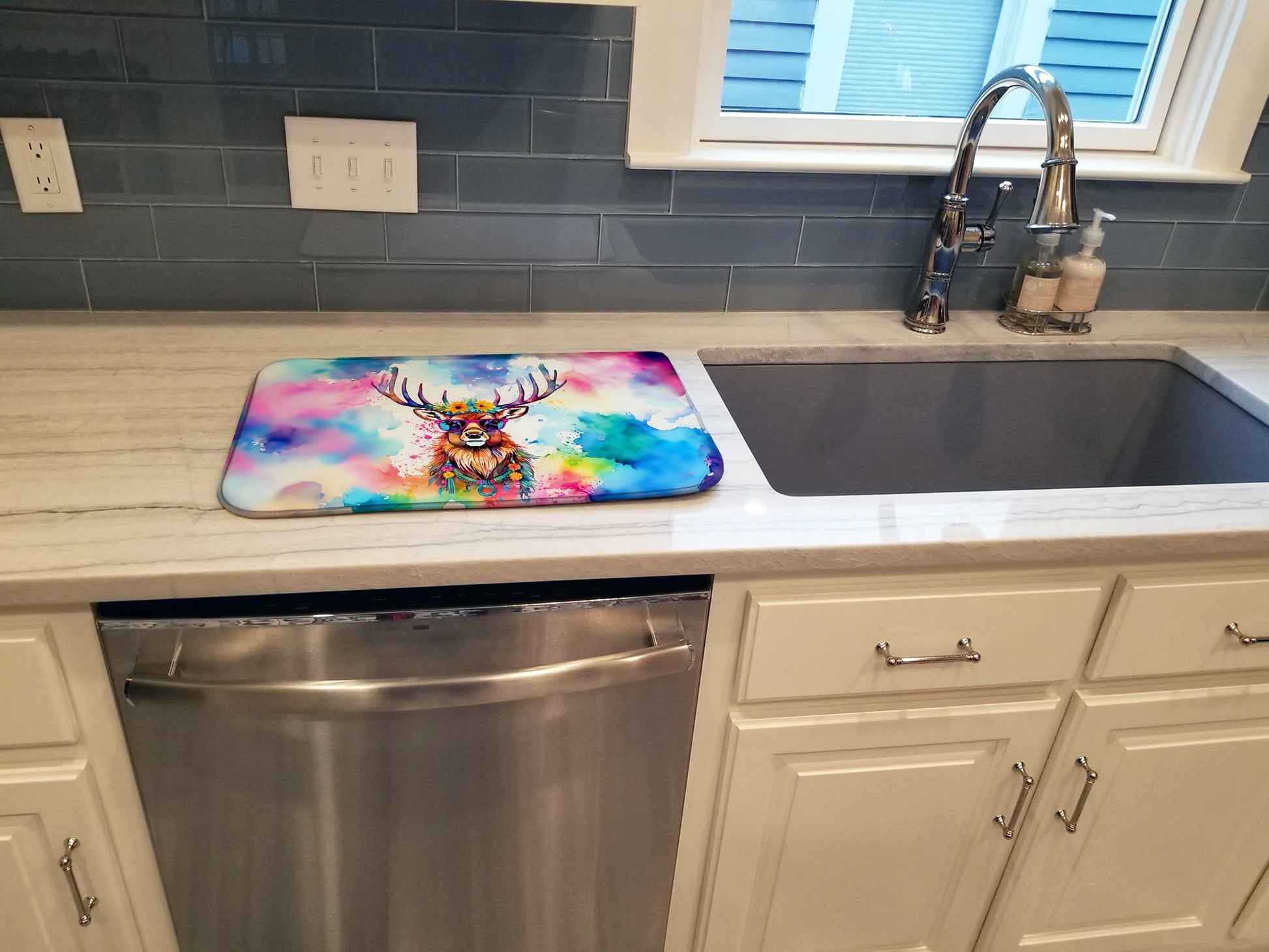Dish Drying Mat featuring breed specific Deer artwork. Say goodbye to messy countertops and soggy dish towels with our innovative dish drying mat. Our high-quality dish drying pad is designed to keep your countertops dry while offering a stylish and efficient solution. Whether you're air drying dishes, glasses, stemware, silverware, pots, pans, bottles, or even fruits and vegetables, our dish mat is the perfect choice. The 14 inches x 22 inches size fits most counters and dish drying racks, and the non-slip design ensures stability. Made with water-absorbent polyester and a polyurethane foam insert, our dish drying mat is not only functional but also durable. It's machine washable and printed in the USA for long-lasting use. The beautiful artwork adds flair to your kitchen decor, making it a perfect housewarming gift or present for any occasion. Upgrade your kitchen experience with our absorbent and versatile dish drying mat.