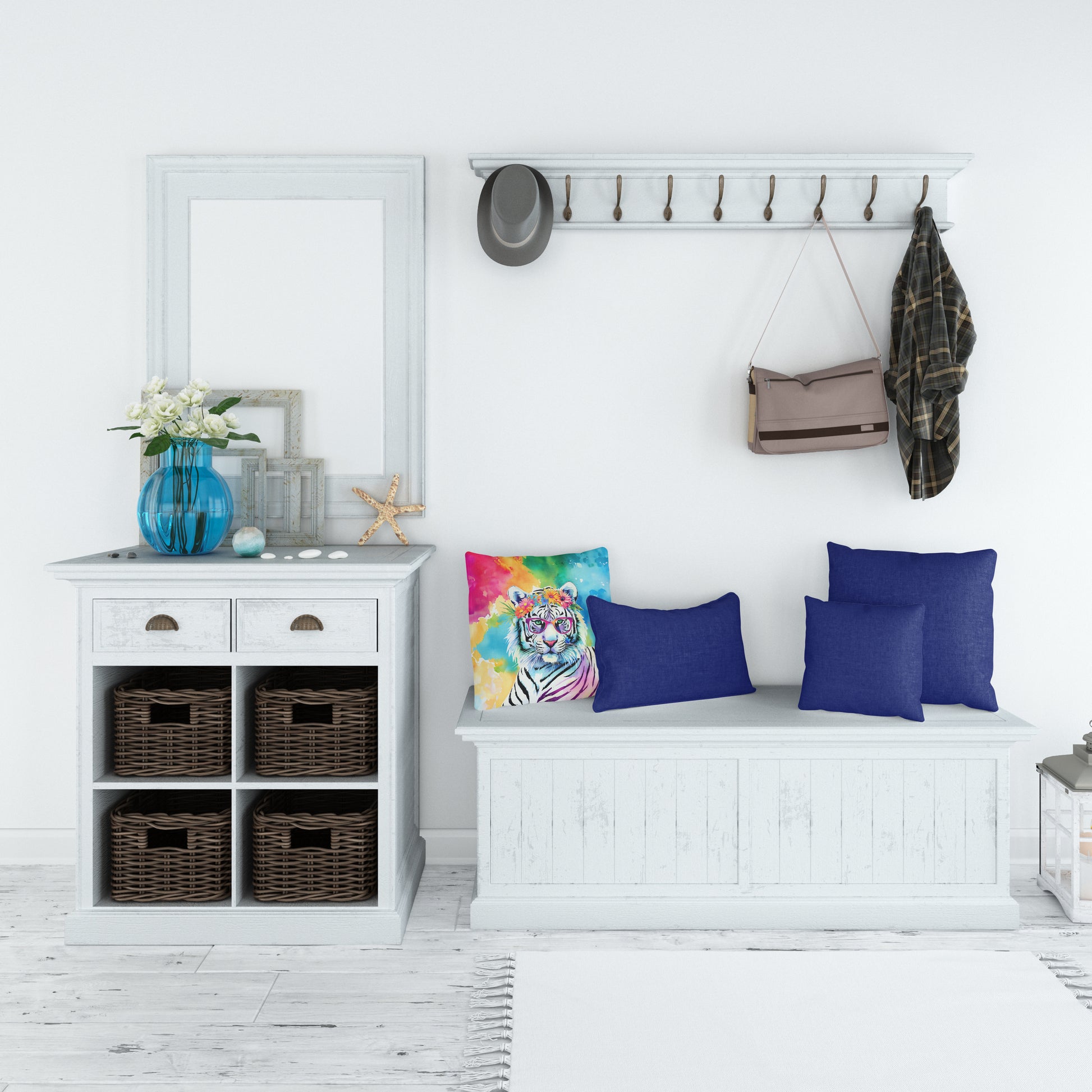 Throw Pillow featuring breed specific White Tiger artwork. Revitalize your outdoor or indoor living space with Caroline's Treasures 18x18 Fabric Decorative Pillow. With a generously sized dimension of approximately 18 inches by 18 inches, this pillow makes a comfortable and aesthetic addition to any seating area. Made from a unique, water-resistant material developed by Caroline's Treasures, the pillow sham is 100% polyester fabric that's durable and ready to weather any condition. Its vibrant, full-color artwork will not fade over time as it is dyed with color-fast dyes. Whether you place it on your patio furniture, porch, veranda, or indoor couch, its soft canvas fabric ensures a cozy experience. The pillow is handcrafted in the United States, featuring a sham created from three pieces of fabric and a polyester insert for enduring shape and overstuffed comfort. Despite being robustly built to endure the outdoors, it is as soft and snug as your favorite indoor cushions. Please note, as all our pillows are handmade, sizes may vary slightly, adding to the charm of this unique decorative item.