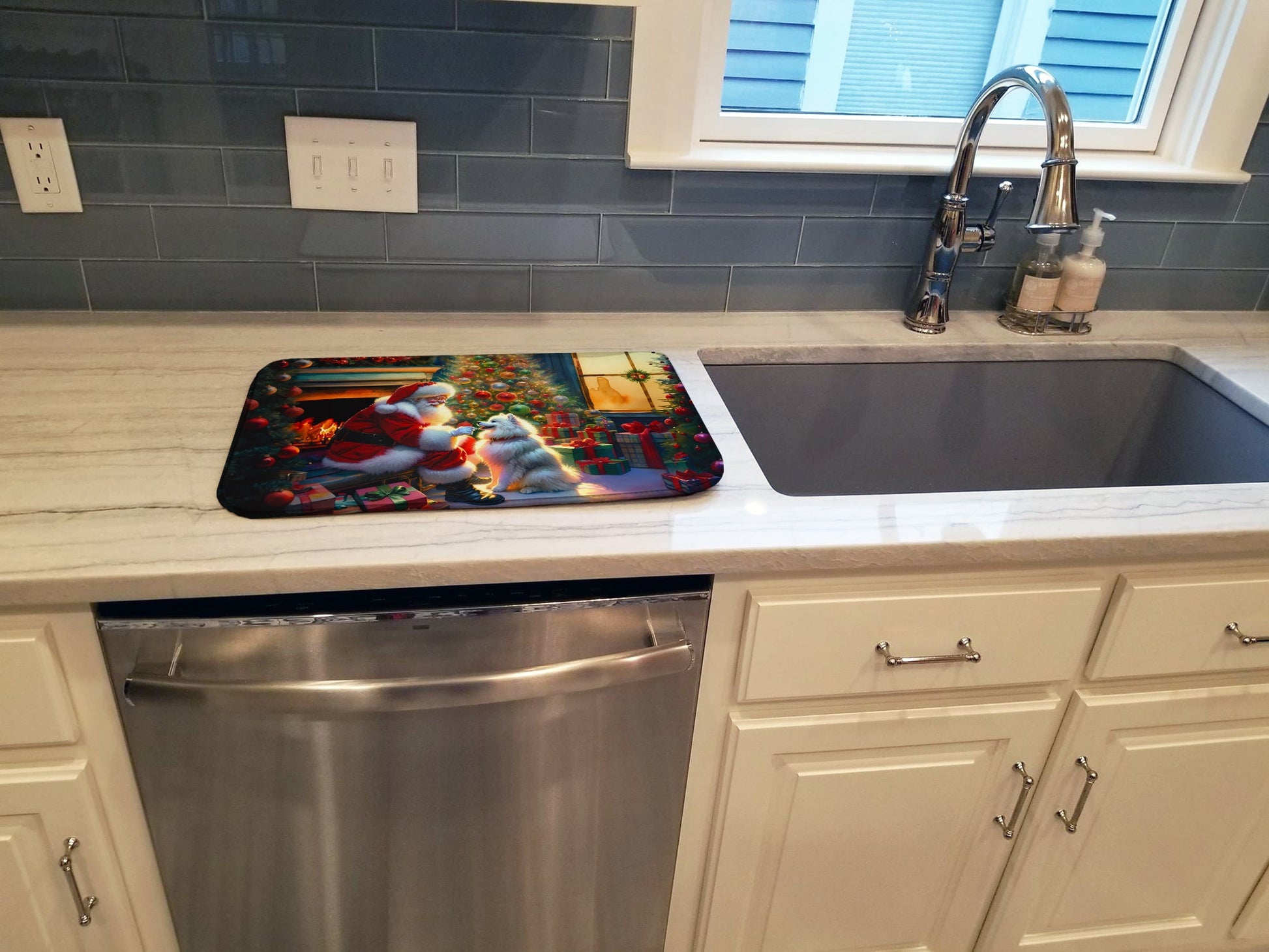 Dish Drying Mat featuring breed specific American Eskimo artwork. Celebrate Christmas with this Christmas Dish Drying Mat. Say goodbye to messy countertops and soggy dish towels with our innovative dish drying mat. Our high-quality dish drying pad is designed to keep your countertops dry while offering a stylish and efficient solution. Whether you're air drying dishes, glasses, stemware, silverware, pots, pans, bottles, or even fruits and vegetables, our dish mat is the perfect choice. The 14 inches x 22 inches size fits most counters and dish drying racks, and the non-slip design ensures stability. Made with water-absorbent polyester and a polyurethane foam insert, our dish drying mat is not only functional but also durable. It's machine washable and printed in the USA for long-lasting use. The beautiful artwork adds flair to your kitchen decor, making it a perfect housewarming gift or present for any occasion. Upgrade your kitchen experience with our absorbent and versatile dish drying mat.