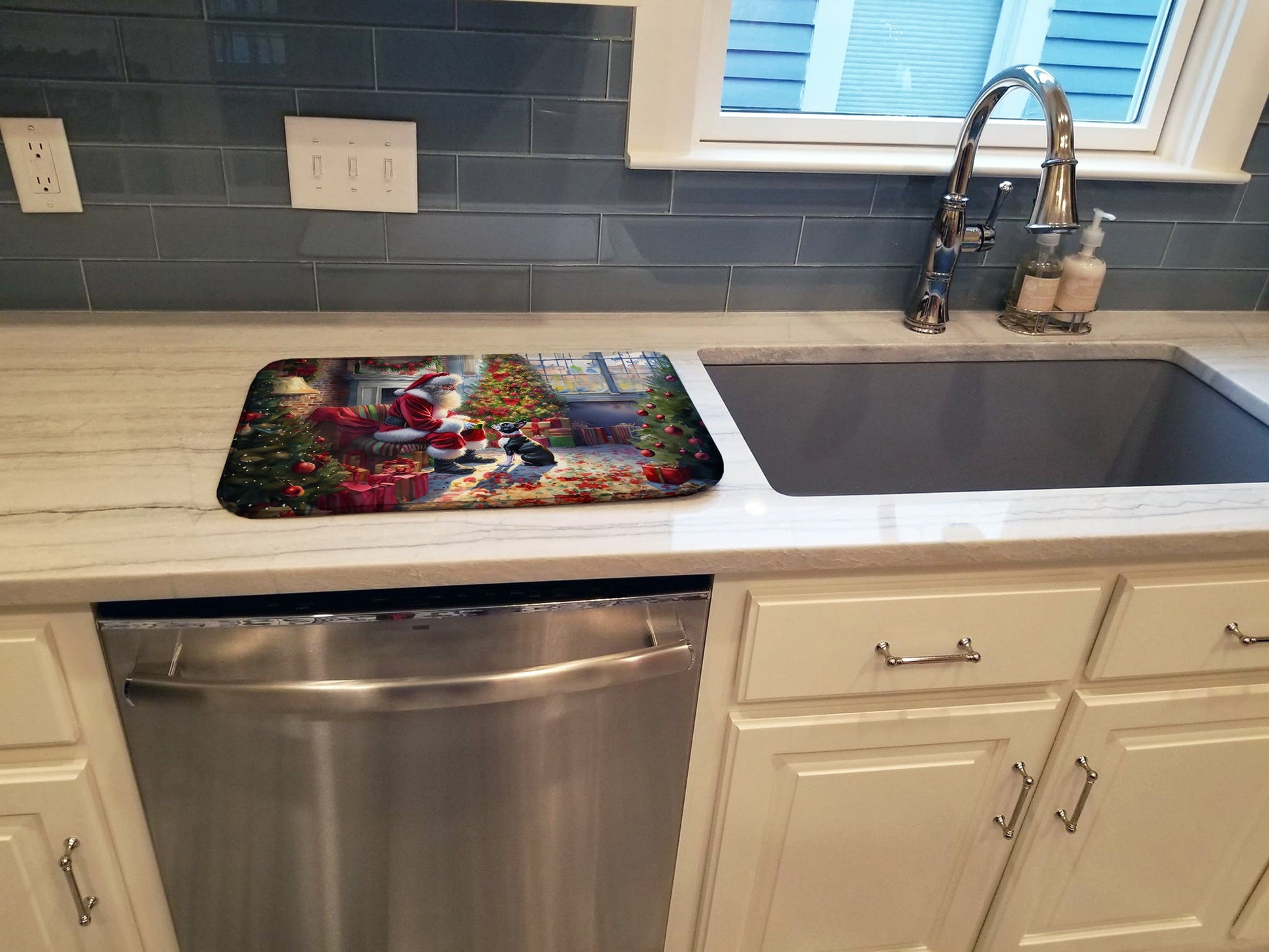 Dish Drying Mat featuring breed specific Boston Terrier artwork. Celebrate Christmas with this Christmas Dish Drying Mat. Say goodbye to messy countertops and soggy dish towels with our innovative dish drying mat. Our high-quality dish drying pad is designed to keep your countertops dry while offering a stylish and efficient solution. Whether you're air drying dishes, glasses, stemware, silverware, pots, pans, bottles, or even fruits and vegetables, our dish mat is the perfect choice. The 14 inches x 22 inches size fits most counters and dish drying racks, and the non-slip design ensures stability. Made with water-absorbent polyester and a polyurethane foam insert, our dish drying mat is not only functional but also durable. It's machine washable and printed in the USA for long-lasting use. The beautiful artwork adds flair to your kitchen decor, making it a perfect housewarming gift or present for any occasion. Upgrade your kitchen experience with our absorbent and versatile dish drying mat.