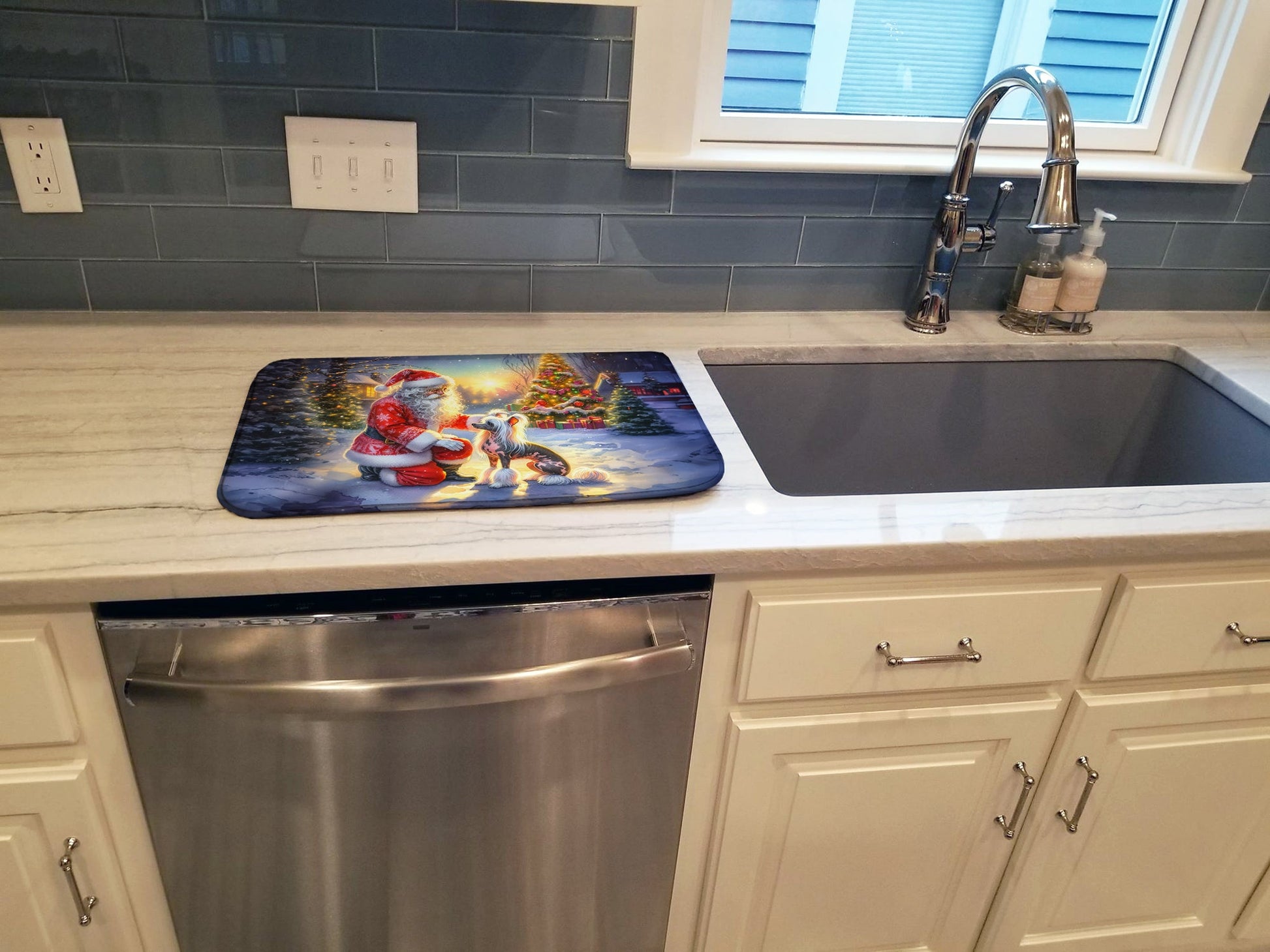 Dish Drying Mat featuring breed specific Chinese Crested artwork. Celebrate Christmas with this Christmas Dish Drying Mat. Say goodbye to messy countertops and soggy dish towels with our innovative dish drying mat. Our high-quality dish drying pad is designed to keep your countertops dry while offering a stylish and efficient solution. Whether you're air drying dishes, glasses, stemware, silverware, pots, pans, bottles, or even fruits and vegetables, our dish mat is the perfect choice. The 14 inches x 22 inches size fits most counters and dish drying racks, and the non-slip design ensures stability. Made with water-absorbent polyester and a polyurethane foam insert, our dish drying mat is not only functional but also durable. It's machine washable and printed in the USA for long-lasting use. The beautiful artwork adds flair to your kitchen decor, making it a perfect housewarming gift or present for any occasion. Upgrade your kitchen experience with our absorbent and versatile dish drying mat.