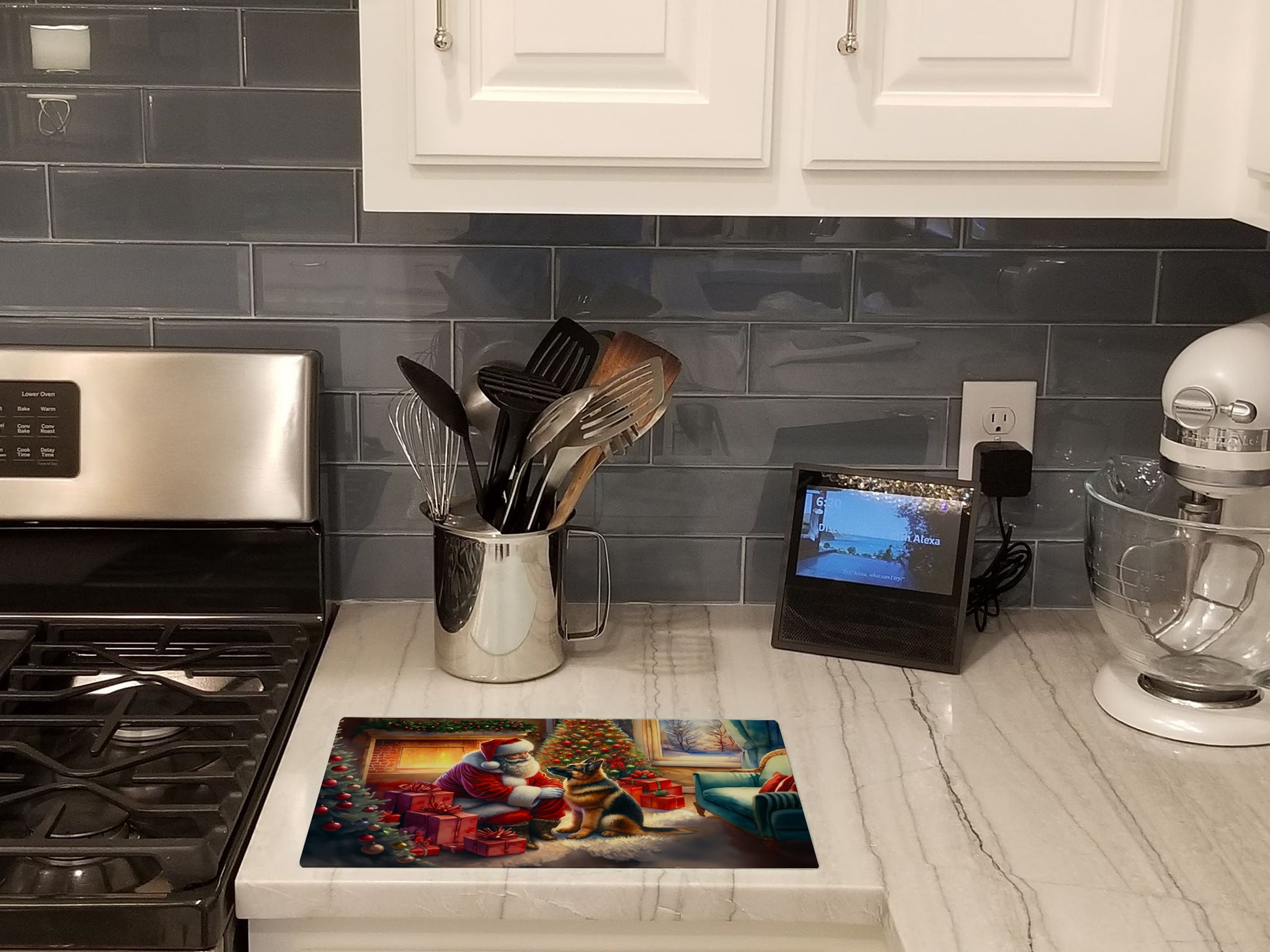 German Shepherd and Santa Claus Glass Cutting Board