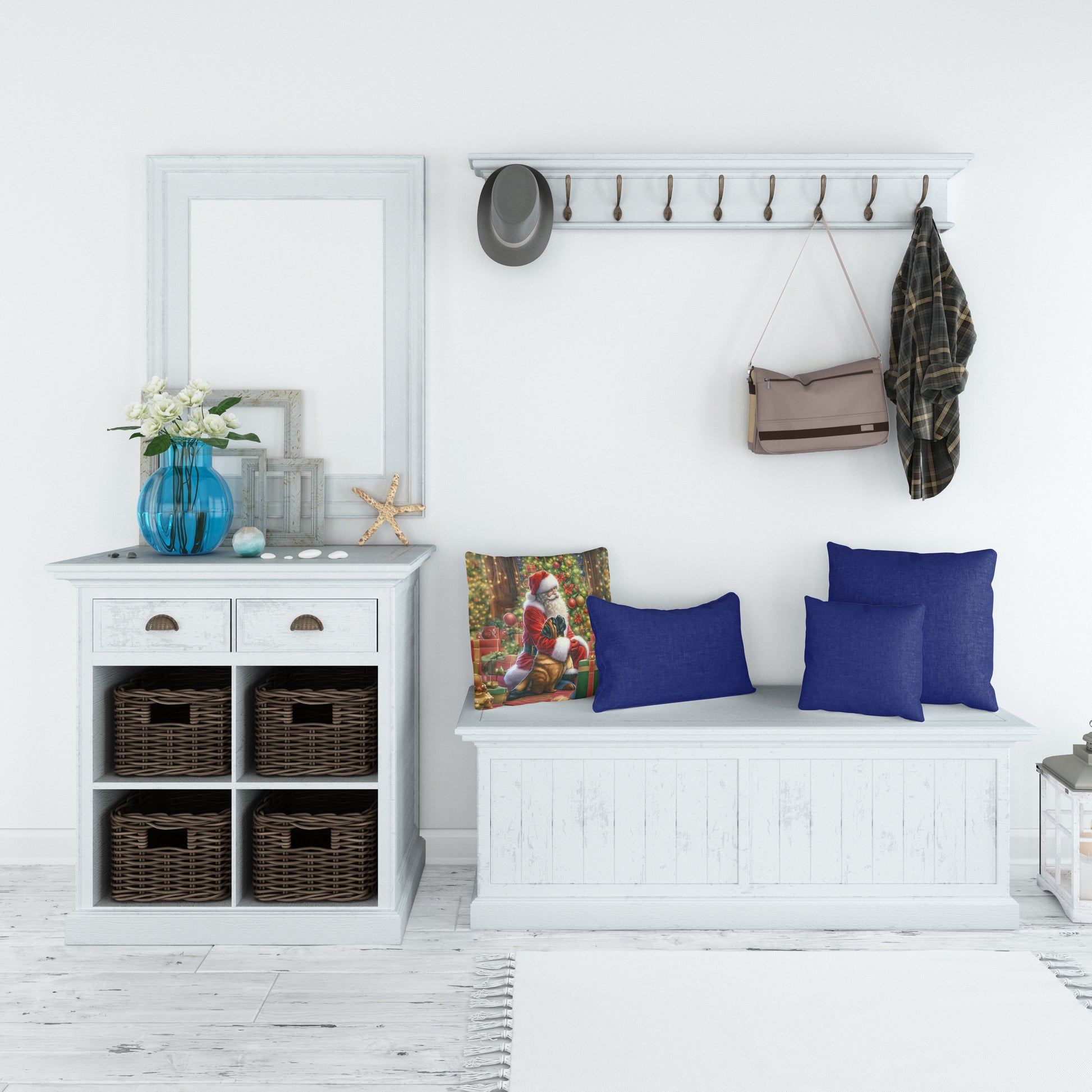 Throw Pillow featuring breed specific Mastiff artwork. Celebrate Christmas with this Christmas Pillow. Revitalize your outdoor or indoor living space with Caroline's Treasures 18x18 Fabric Decorative Pillow. With a generously sized dimension of approximately 18 inches by 18 inches, this pillow makes a comfortable and aesthetic addition to any seating area. Made from a unique, water-resistant material developed by Caroline's Treasures, the pillow sham is 100% polyester fabric that's durable and ready to weather any condition. Its vibrant, full-color artwork will not fade over time as it is dyed with color-fast dyes. Whether you place it on your patio furniture, porch, veranda, or indoor couch, its soft canvas fabric ensures a cozy experience. The pillow is handcrafted in the United States, featuring a sham created from three pieces of fabric and a polyester insert for enduring shape and overstuffed comfort. Despite being robustly built to endure the outdoors, it is as soft and snug as your favorite indoor cushions. Please note, as all our pillows are handmade, sizes may vary slightly, adding to the charm of this unique decorative item.