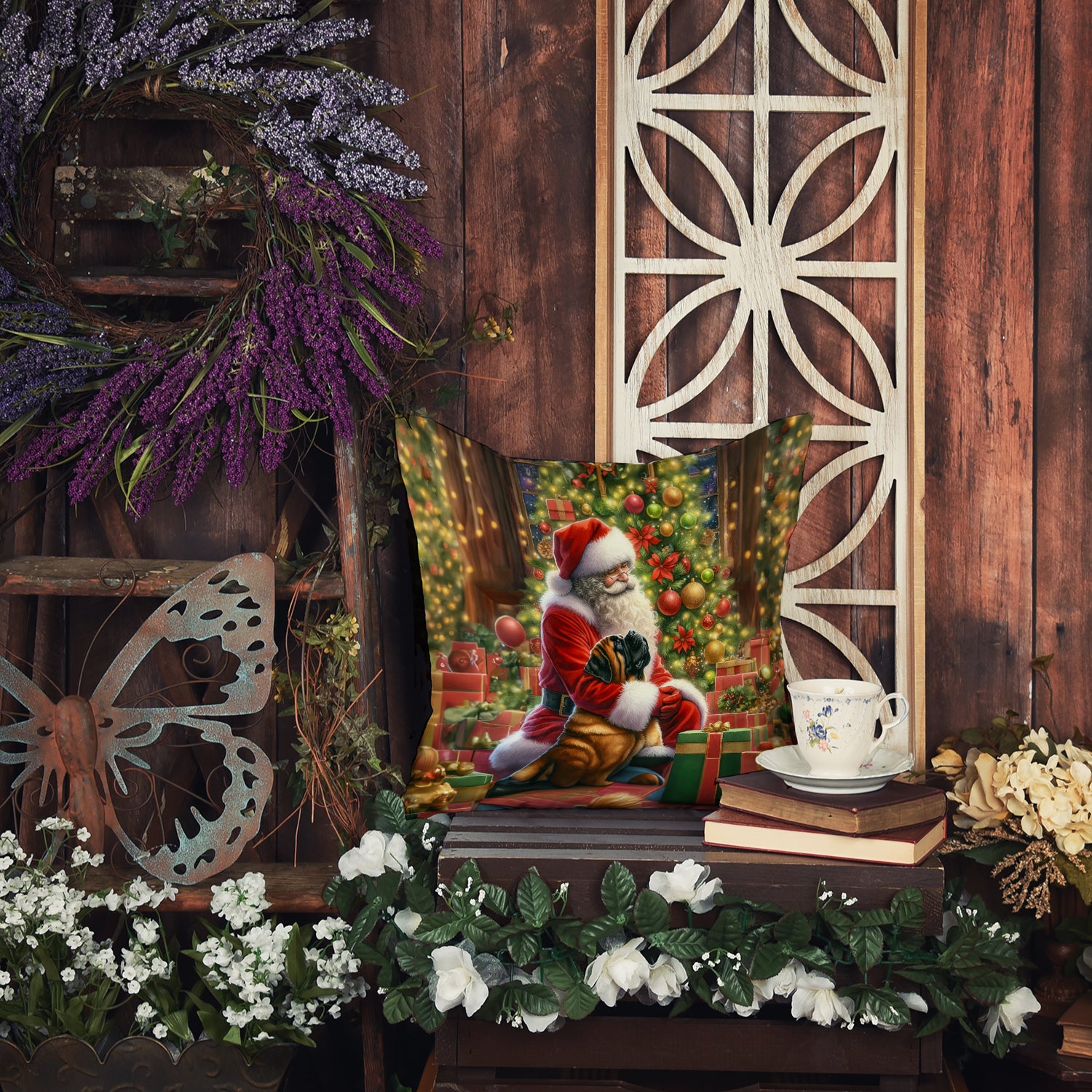 Mastiff and Santa Claus Throw Pillow