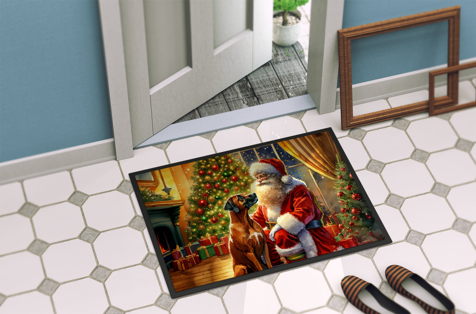 Doormat featuring breed specific Rhodesian Ridgeback artwork. Celebrate Christmas with this Christmas Doormat. Welcome your guests in style with our Artwork Door Mat, designed to withstand almost any weather condition. This mat, measuring approximately 18 by 27 inches, is held together by durable black binding tape. Its top layer, composed of polyester felt, is dyed with the eye-catching image you see on the mat. A few layers below provide the mat with stability, while its rubber bottom is stamped to help prevent slipping and ensures safety. Our mat works wonderfully as both an indoor or outdoor door mat. For cleaning, simply hose it off with water or use a power washer - no need for any cleaner that produces suds. Avoid scrubbing with a brush, instead, opt for the vacuum on floor setting. Designed manufactured and printed in the USA, this mat is a perfect addition to your porch, outdoor kitchen, entryway, or any indoor space. Its unique design makes it a charming decorative rug that greets your guests and adds a stylish touch to your home decor.