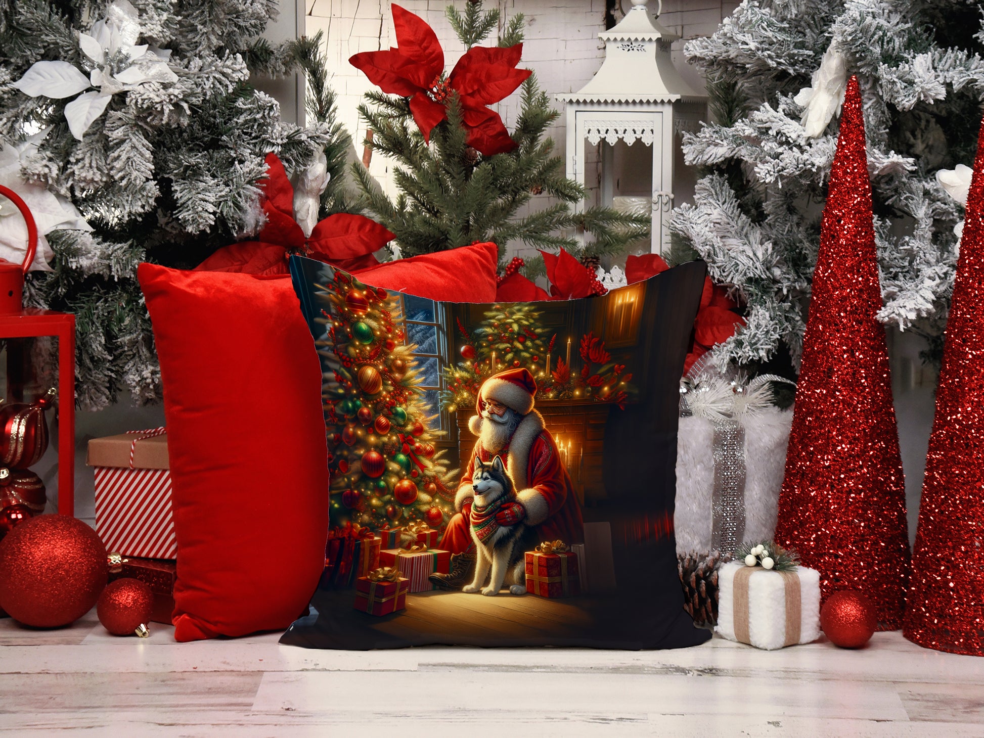 Siberian Husky and Santa Claus Throw Pillow