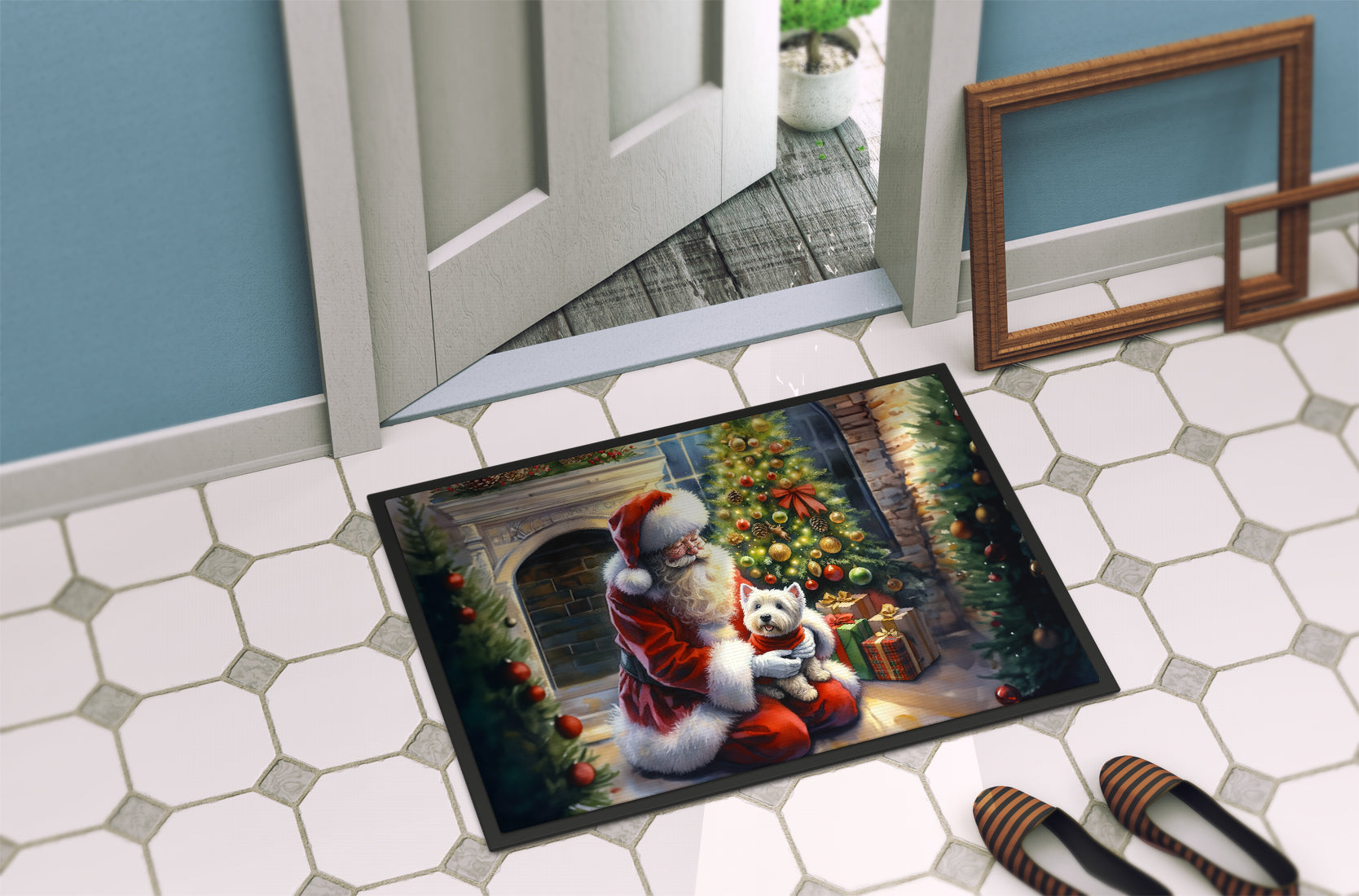 Doormat featuring breed specific West Highland White Terrier artwork. Celebrate Christmas with this Christmas Doormat. Welcome your guests in style with our Artwork Door Mat, designed to withstand almost any weather condition. This mat, measuring approximately 18 by 27 inches, is held together by durable black binding tape. Its top layer, composed of polyester felt, is dyed with the eye-catching image you see on the mat. A few layers below provide the mat with stability, while its rubber bottom is stamped to help prevent slipping and ensures safety. Our mat works wonderfully as both an indoor or outdoor door mat. For cleaning, simply hose it off with water or use a power washer - no need for any cleaner that produces suds. Avoid scrubbing with a brush, instead, opt for the vacuum on floor setting. Designed manufactured and printed in the USA, this mat is a perfect addition to your porch, outdoor kitchen, entryway, or any indoor space. Its unique design makes it a charming decorative rug that greets your guests and adds a stylish touch to your home decor.