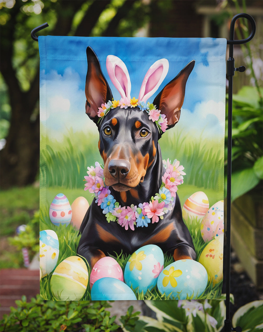 Garden Flag featuring breed specific Doberman Pinscher artwork. Celebrate Easter with this Easter Garden Flag. Enhance the beauty of your garden, patio, or yard with Caroline's Treasures Decorative Garden Flag, proudly made in the USA. Crafted from two pieces of thick, double-sided polyester fabric, this 2-ply garden flag is designed to withstand various weather conditions, making it water-resistant and weatherproof. Featuring correctly readable words on both sides, this garden flag offers a delightful visual experience from any angle. With its heavier weight, it stands out among other garden flags, ensuring stability and durability even in wind, rain, and snow. Measuring approximately 11 1/4 inches by 15 1/2 inches, this flag allows you to personalize your outdoor decor. It comes with a 1 1/2-inch sleeve sewn in, allowing easy attachment to any standard garden flag stand or garden size porch hanger (sold separately). Make a statement in your outdoor space with Caroline's Treasures Decorative Garden Flag, a vibrant and high-quality flag that adds color and personality to your surroundings. Proudly made in the USA, it's a symbol of quality craftsmanship and attention to detail.