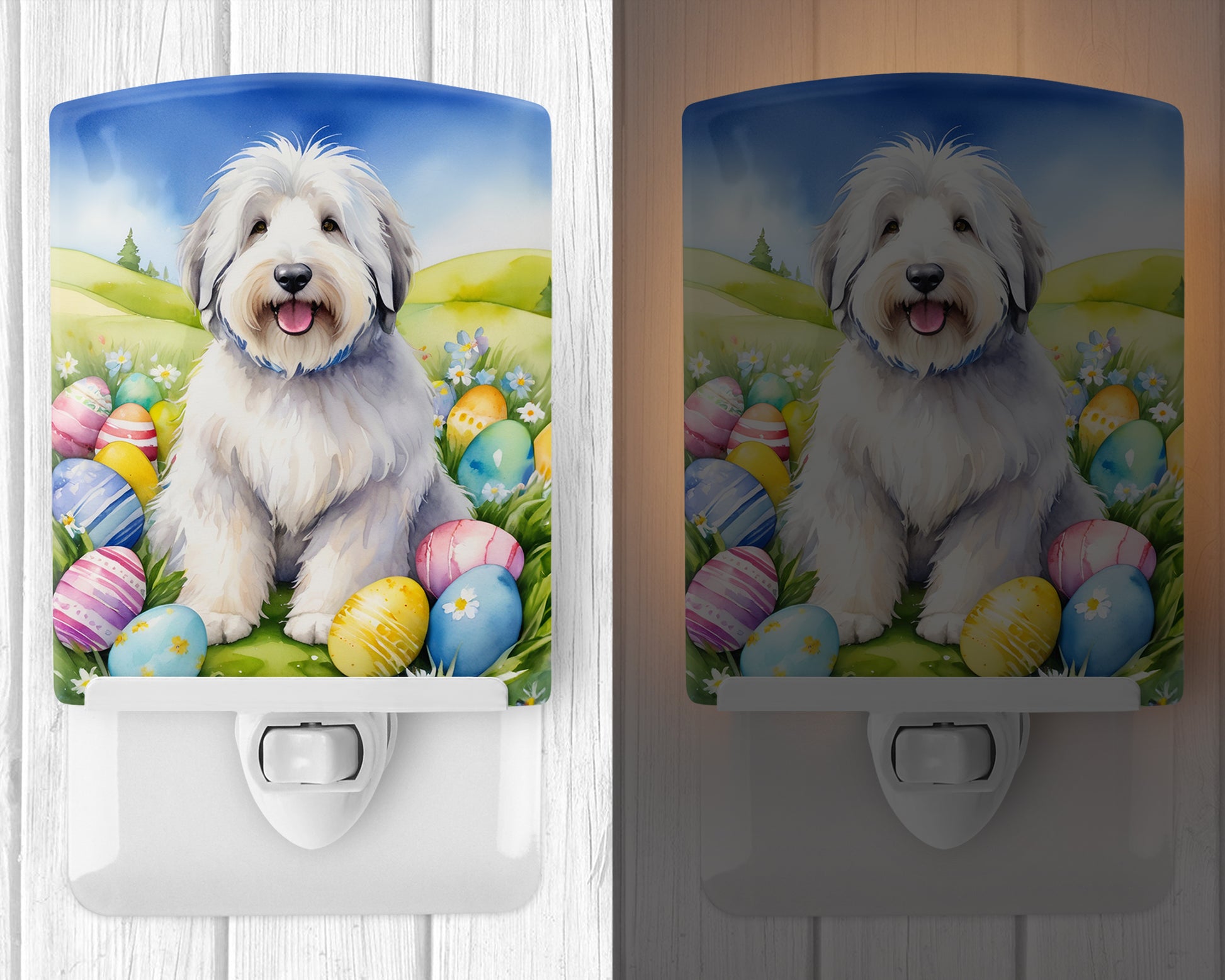 Ceramic Night Light featuring breed specific Old English Sheepdog artwork. Celebrate Easter with this Easter Night Light. Introduce a splash of artistic flair and subtle illumination to your space with the Decorative Ceramic Night Light from Caroline's Treasures. Perfect for any room, this night light seamlessly blends functionality with an aesthetic appeal, offering a stylish solution to brighten up dark corners of your home or office. Boasting a six-inch high by four-inch wide ceramic tile at the front, it showcases vivid, full-color artwork from distinguished artists, transforming a simple utility into a vibrant art piece. The artwork is securely encased in a robust metal holder, ensuring durability and longevity. Two screws are provided to firmly affix the tile into the holder. The holder extends three inches deep, housing an included bulb that emits a soft, welcoming glow. This product meets all safety standards, as evidenced by its UL approval. Proudly made in the United States from imported components, this Decorative Ceramic Night Light is not just a functional device; it's a statement piece that enhances the ambiance of your surroundings.