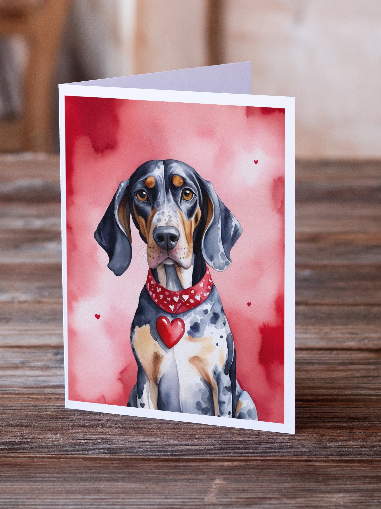 Greeting Cards Pack of 8 featuring breed specific Bluetick Coonhound artwork. Celebrate Valentine's Day with this Valentine's Day . Celebrate special moments with Caroline's Treasures Printed Greeting Card Pack. This pack includes eight beautifully folded 5x7 cards, accompanied by eight matching white envelopes. With blank interiors, these cards provide ample space for your personalized messages and heartfelt holiday greetings. Each card features captivating full-color artwork, meticulously printed in our facility on high-quality 80 lb cover stock or 216 GSM. The super smooth finish of the white cards enhances the visual impact of the artwork, creating a truly stunning presentation. Designed by our talented in-house artists or licensed artists, the artwork on these cards showcases their creativity and attention to detail. From vibrant illustrations to captivating designs, each card tells its own unique story. Whether it's for birthdays, anniversaries, holidays, or any special occasion, Caroline's Treasures Greeting Card Pack is the perfect way to convey your heartfelt sentiments. Share joy, love, and warm wishes with these exquisite cards and make every moment unforgettable.
