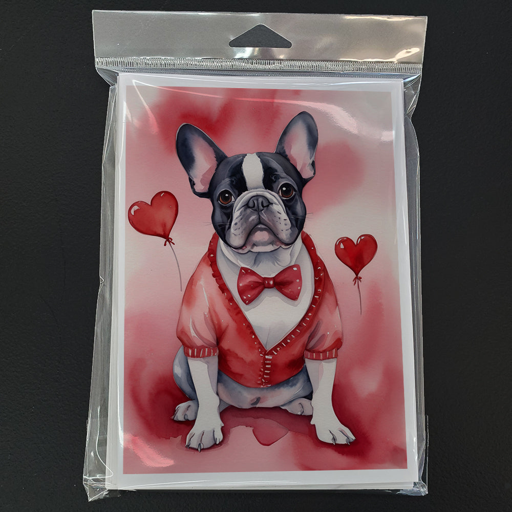 Greeting Cards Pack of 8 featuring breed specific French Bulldog artwork. Celebrate Valentine's Day with this Valentine's Day . Celebrate special moments with Caroline's Treasures Printed Greeting Card Pack. This pack includes eight beautifully folded 5x7 cards, accompanied by eight matching white envelopes. With blank interiors, these cards provide ample space for your personalized messages and heartfelt holiday greetings. Each card features captivating full-color artwork, meticulously printed in our facility on high-quality 80 lb cover stock or 216 GSM. The super smooth finish of the white cards enhances the visual impact of the artwork, creating a truly stunning presentation. Designed by our talented in-house artists or licensed artists, the artwork on these cards showcases their creativity and attention to detail. From vibrant illustrations to captivating designs, each card tells its own unique story. Whether it's for birthdays, anniversaries, holidays, or any special occasion, Caroline's Treasures Greeting Card Pack is the perfect way to convey your heartfelt sentiments. Share joy, love, and warm wishes with these exquisite cards and make every moment unforgettable.