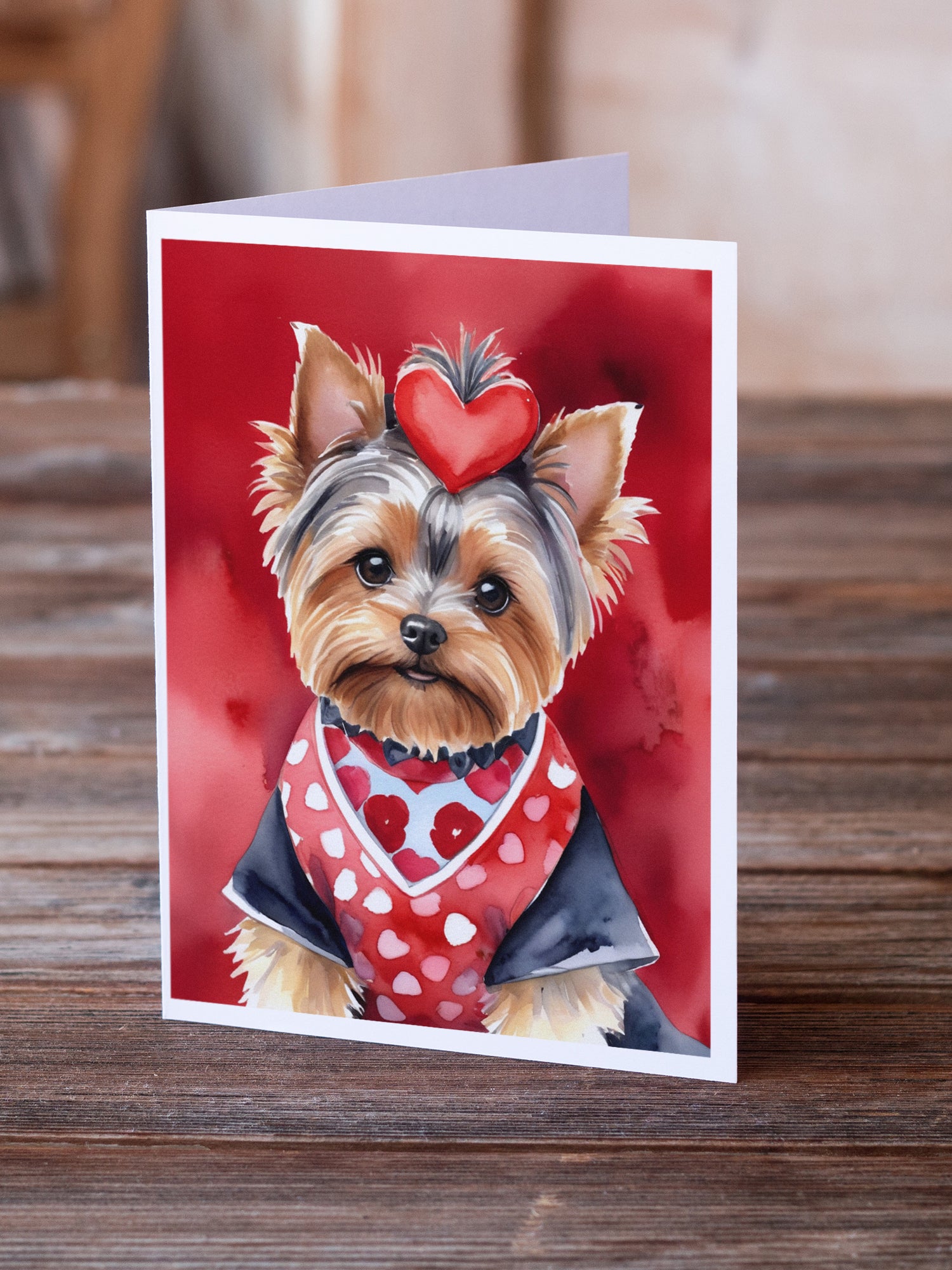 Greeting Cards Pack of 8 featuring breed specific Yorkshire Terrier artwork. Celebrate Valentine's Day with this Valentine's Day . Celebrate special moments with Caroline's Treasures Printed Greeting Card Pack. This pack includes eight beautifully folded 5x7 cards, accompanied by eight matching white envelopes. With blank interiors, these cards provide ample space for your personalized messages and heartfelt holiday greetings. Each card features captivating full-color artwork, meticulously printed in our facility on high-quality 80 lb cover stock or 216 GSM. The super smooth finish of the white cards enhances the visual impact of the artwork, creating a truly stunning presentation. Designed by our talented in-house artists or licensed artists, the artwork on these cards showcases their creativity and attention to detail. From vibrant illustrations to captivating designs, each card tells its own unique story. Whether it's for birthdays, anniversaries, holidays, or any special occasion, Caroline's Treasures Greeting Card Pack is the perfect way to convey your heartfelt sentiments. Share joy, love, and warm wishes with these exquisite cards and make every moment unforgettable.