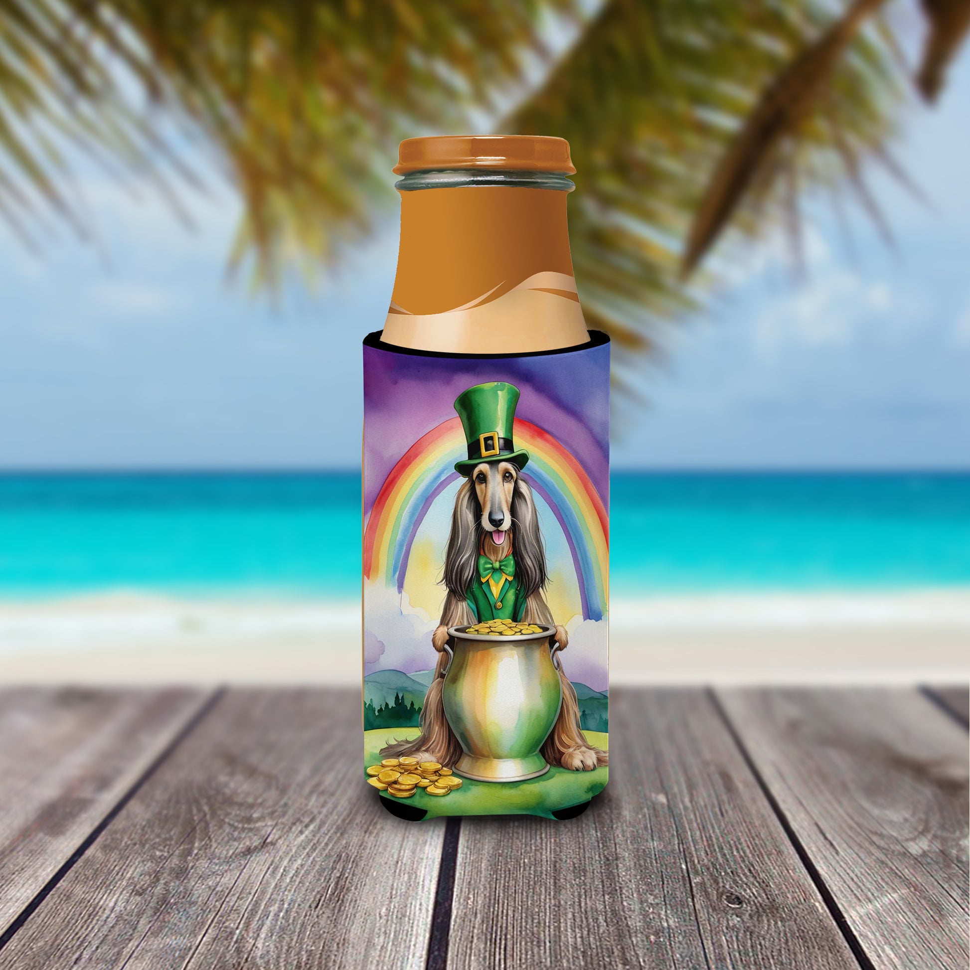 Hugger for Ultra Slim Cans featuring breed specific Afghan Hound artwork. Celebrate St Patrick's Day with this St Patrick's Day Slim Can Hugger. Elevate your beverage experience with our Slim Can Huggers, uniquely designed to fit a variety of your favorite 12 oz slim cans. Perfectly suited for Michelob Ultra, Starbucks Refreshers, Heineken Light, Bud Lite Lime, Dry Soda, Coors, Resin, Vitaminwater Energy, and Perrier Cans, our huggers ensure your drink stays refreshingly cool. The feature that sets our can huggers apart is the striking full-color artwork, exclusively created by one of our talented artists. It adds a touch of individuality and style to your drink, making it easier to identify in a crowd. A unique blend of practicality and flair, these huggers are an absolute must-have at any gathering. Our can huggers are not just beautiful but also incredibly durable. The design won't fade or peel off, and they can be safely cleaned in a washing machine. These collapsible beverage insulators are easy to store and transport, making them perfect for all occasions. Enjoy your drinks in style and comfort with our exceptional Slim Can Huggers.