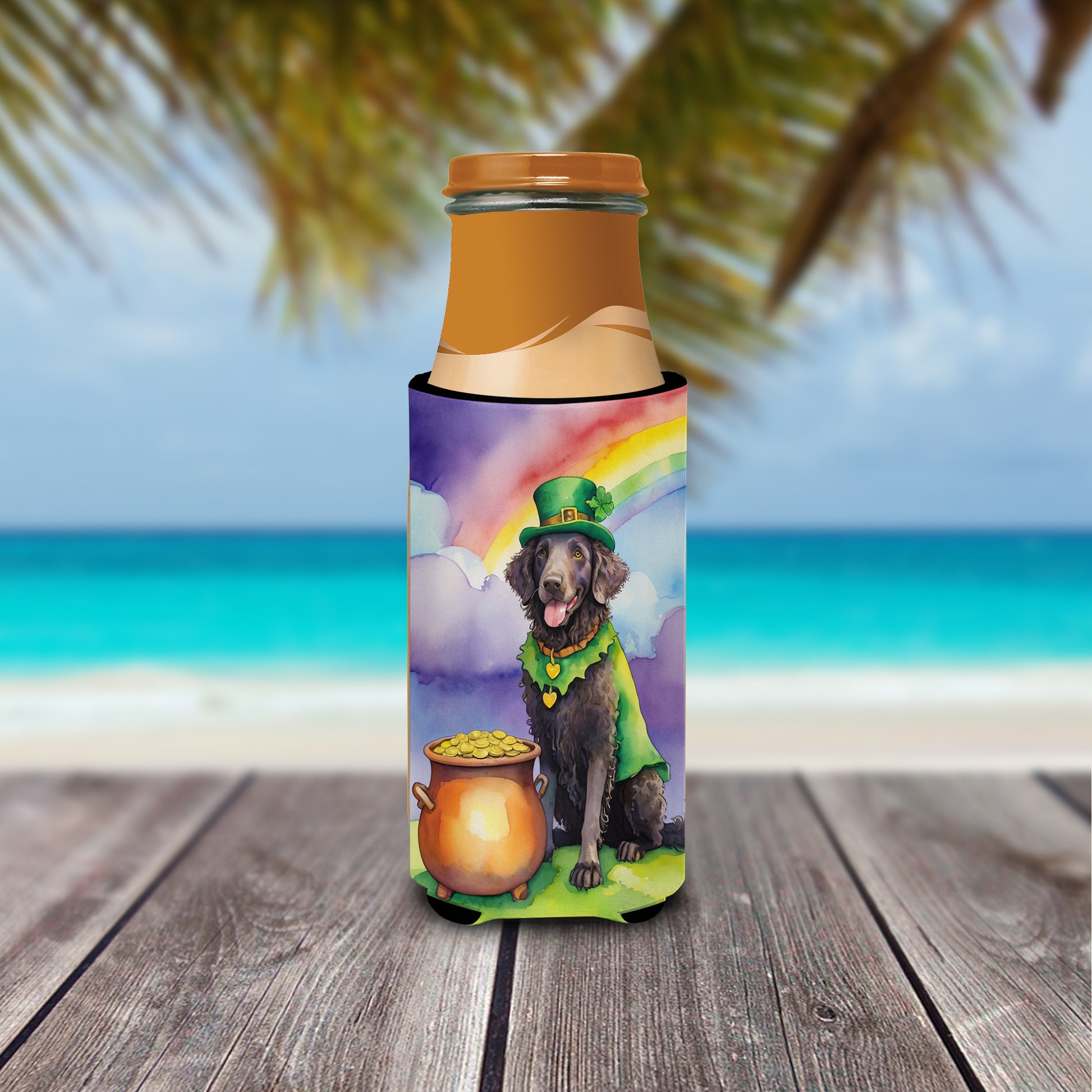 Hugger for Ultra Slim Cans featuring breed specific Curly-Coated Retriever artwork. Celebrate St Patrick's Day with this St Patrick's Day Slim Can Hugger. Elevate your beverage experience with our Slim Can Huggers, uniquely designed to fit a variety of your favorite 12 oz slim cans. Perfectly suited for Michelob Ultra, Starbucks Refreshers, Heineken Light, Bud Lite Lime, Dry Soda, Coors, Resin, Vitaminwater Energy, and Perrier Cans, our huggers ensure your drink stays refreshingly cool. The feature that sets our can huggers apart is the striking full-color artwork, exclusively created by one of our talented artists. It adds a touch of individuality and style to your drink, making it easier to identify in a crowd. A unique blend of practicality and flair, these huggers are an absolute must-have at any gathering. Our can huggers are not just beautiful but also incredibly durable. The design won't fade or peel off, and they can be safely cleaned in a washing machine. These collapsible beverage insulators are easy to store and transport, making them perfect for all occasions. Enjoy your drinks in style and comfort with our exceptional Slim Can Huggers.