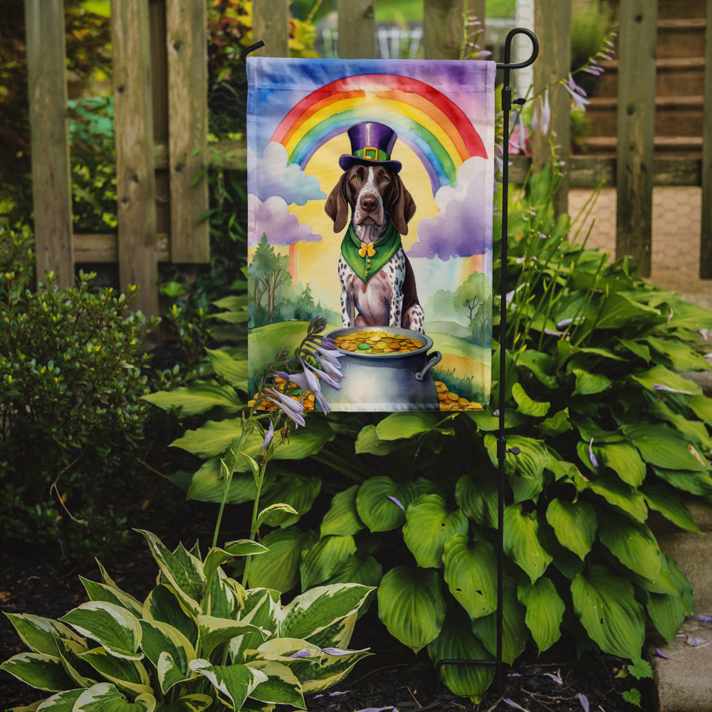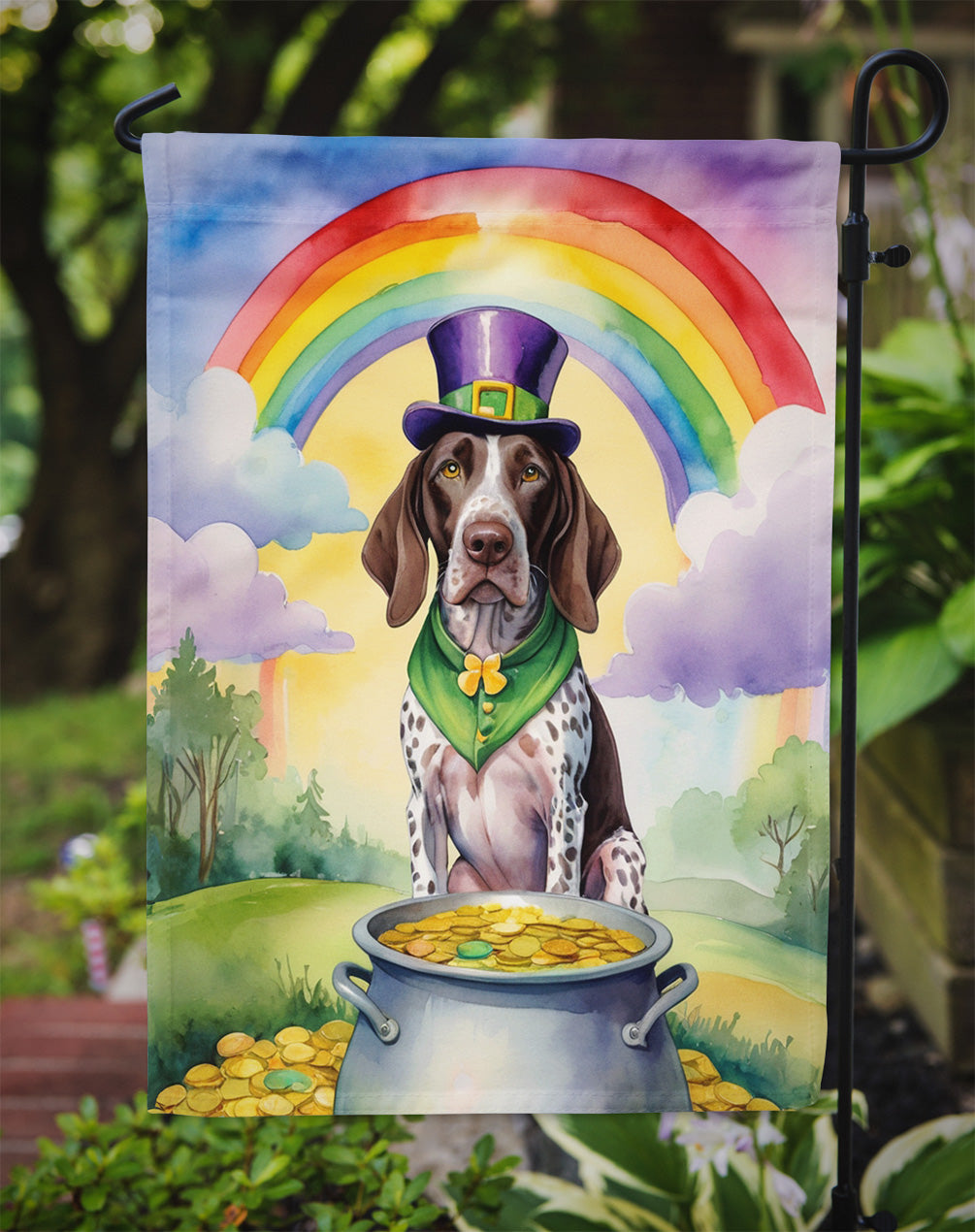 Garden Flag featuring breed specific German Shorthaired Pointer artwork. Celebrate St Patrick's Day with this St Patrick's Day Garden Flag. Enhance the beauty of your garden, patio, or yard with Caroline's Treasures Decorative Garden Flag, proudly made in the USA. Crafted from two pieces of thick, double-sided polyester fabric, this 2-ply garden flag is designed to withstand various weather conditions, making it water-resistant and weatherproof. Featuring correctly readable words on both sides, this garden flag offers a delightful visual experience from any angle. With its heavier weight, it stands out among other garden flags, ensuring stability and durability even in wind, rain, and snow. Measuring approximately 11 1/4 inches by 15 1/2 inches, this flag allows you to personalize your outdoor decor. It comes with a 1 1/2-inch sleeve sewn in, allowing easy attachment to any standard garden flag stand or garden size porch hanger (sold separately). Make a statement in your outdoor space with Caroline's Treasures Decorative Garden Flag, a vibrant and high-quality flag that adds color and personality to your surroundings. Proudly made in the USA, it's a symbol of quality craftsmanship and attention to detail.
