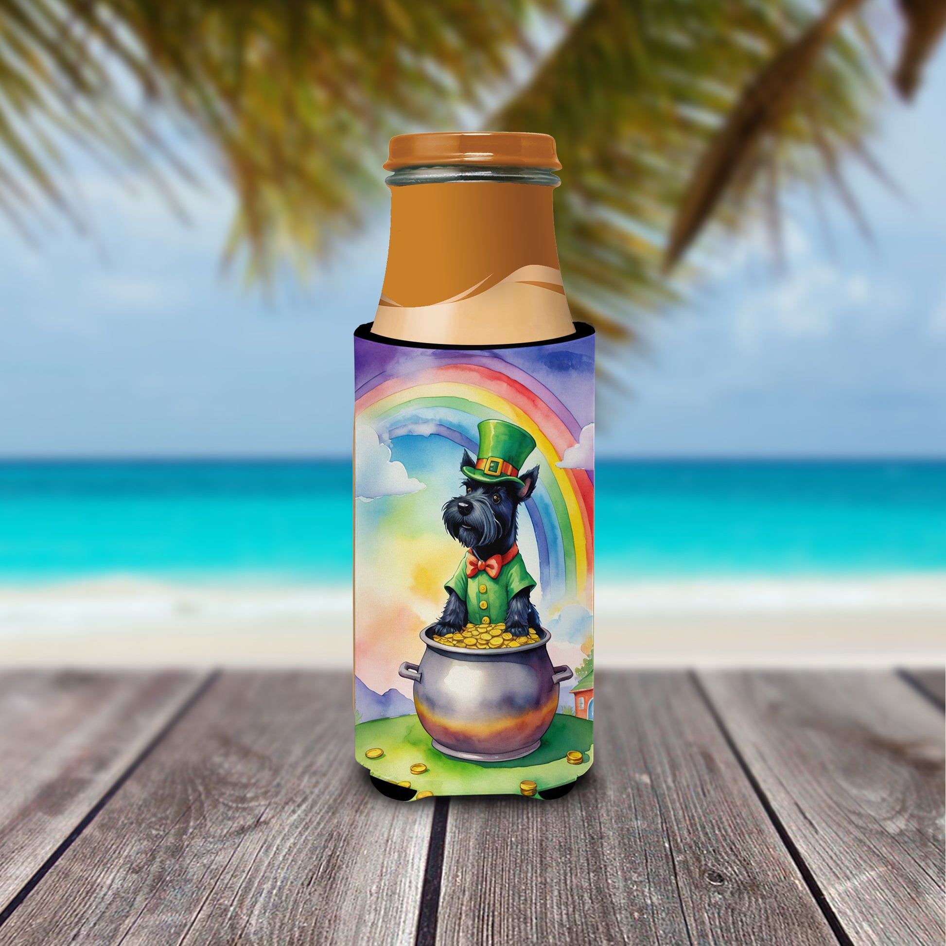 Hugger for Ultra Slim Cans featuring breed specific Scottish Terrier artwork. Celebrate St Patrick's Day with this St Patrick's Day Slim Can Hugger. Elevate your beverage experience with our Slim Can Huggers, uniquely designed to fit a variety of your favorite 12 oz slim cans. Perfectly suited for Michelob Ultra, Starbucks Refreshers, Heineken Light, Bud Lite Lime, Dry Soda, Coors, Resin, Vitaminwater Energy, and Perrier Cans, our huggers ensure your drink stays refreshingly cool. The feature that sets our can huggers apart is the striking full-color artwork, exclusively created by one of our talented artists. It adds a touch of individuality and style to your drink, making it easier to identify in a crowd. A unique blend of practicality and flair, these huggers are an absolute must-have at any gathering. Our can huggers are not just beautiful but also incredibly durable. The design won't fade or peel off, and they can be safely cleaned in a washing machine. These collapsible beverage insulators are easy to store and transport, making them perfect for all occasions. Enjoy your drinks in style and comfort with our exceptional Slim Can Huggers.
