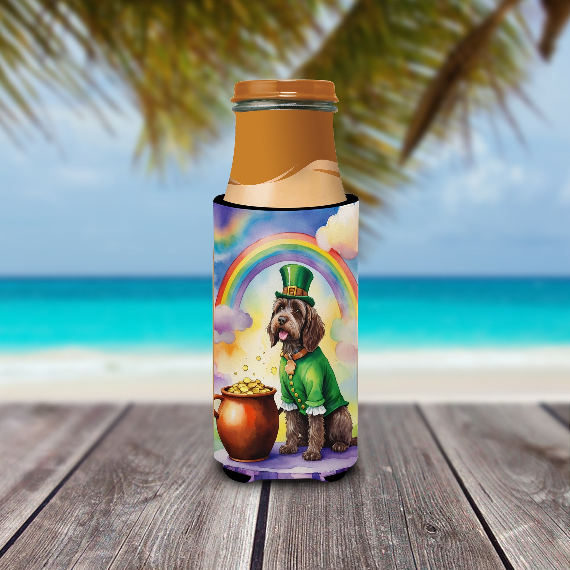 Hugger for Ultra Slim Cans featuring breed specific Wirehaired Pointing Griffon artwork. Celebrate St Patrick's Day with this St Patrick's Day Slim Can Hugger. Elevate your beverage experience with our Slim Can Huggers, uniquely designed to fit a variety of your favorite 12 oz slim cans. Perfectly suited for Michelob Ultra, Starbucks Refreshers, Heineken Light, Bud Lite Lime, Dry Soda, Coors, Resin, Vitaminwater Energy, and Perrier Cans, our huggers ensure your drink stays refreshingly cool. The feature that sets our can huggers apart is the striking full-color artwork, exclusively created by one of our talented artists. It adds a touch of individuality and style to your drink, making it easier to identify in a crowd. A unique blend of practicality and flair, these huggers are an absolute must-have at any gathering. Our can huggers are not just beautiful but also incredibly durable. The design won't fade or peel off, and they can be safely cleaned in a washing machine. These collapsible beverage insulators are easy to store and transport, making them perfect for all occasions. Enjoy your drinks in style and comfort with our exceptional Slim Can Huggers.